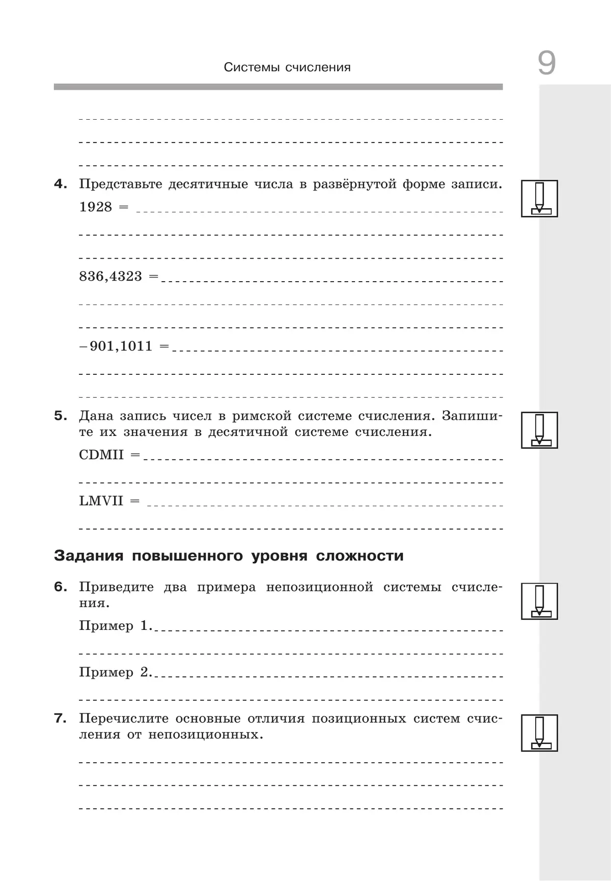 Представлены задания для выполнения как в тетради (с кратким ответом, на установление соответствия, с выбором верного варианта ответа, итоговый контроль в тестовой форме и пр.), так и на компьютере.