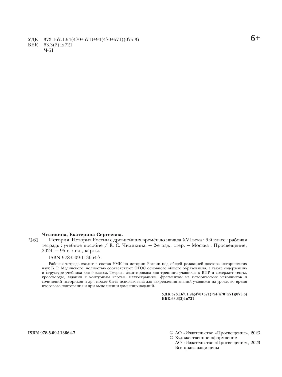 Рабочая тетрадь входит в состав УМК по истории России под общей редакцией доктора исторических наук В. Р. Мединского, полностью соответствует ФГОС основного общего образования, а также содержанию и структуре учебника для 6 класса.