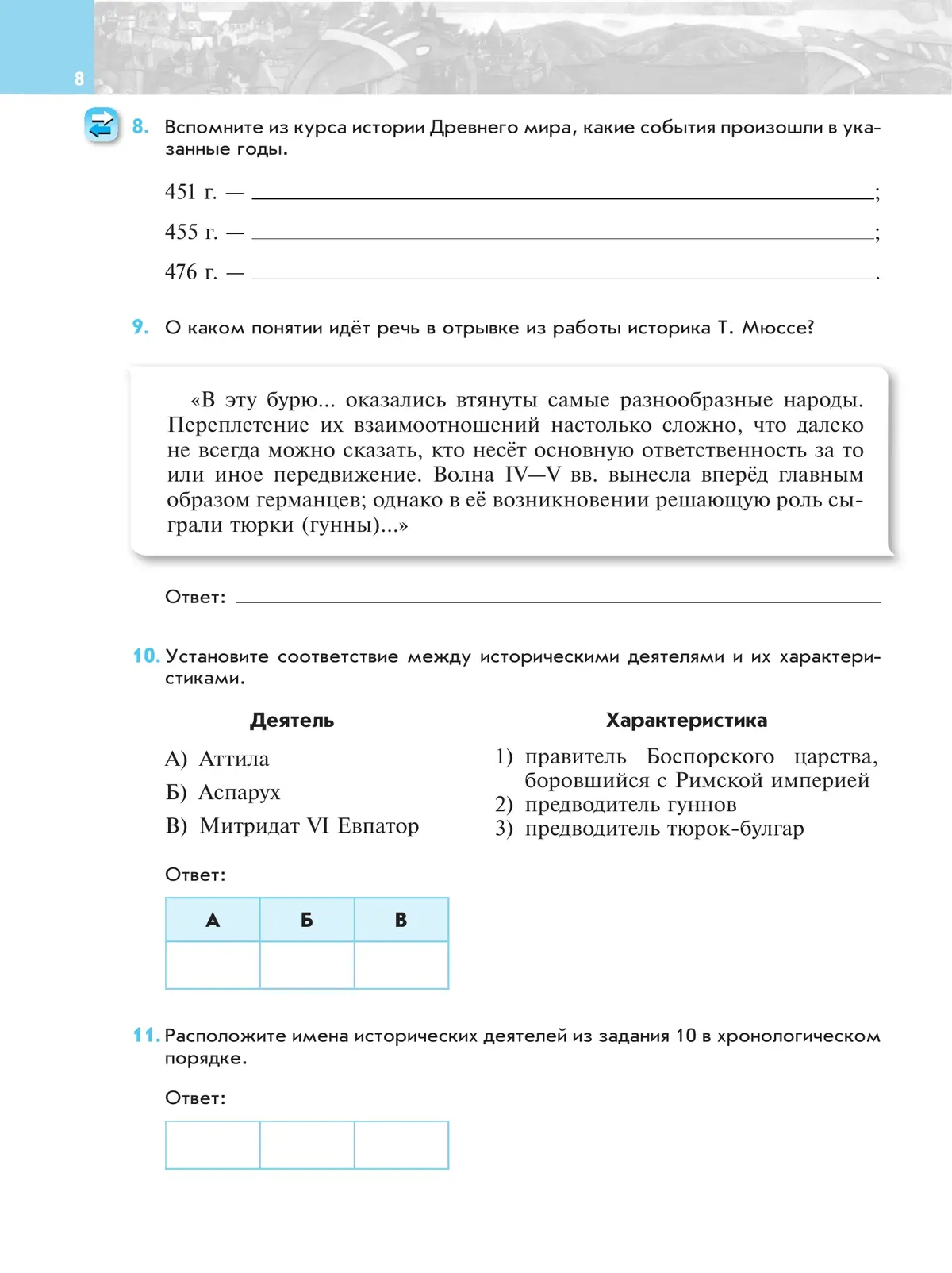 Тетрадь адаптирована для тренинга учащихся к ВПР и содержит тесты, кроссворды, задания к контурным картам, иллюстрациям, фрагментам из исторических источников и сочинений историков и др.; может быть использована для закрепления знаний учащихся на уроке, во время итогового повторения и при выполнении домашних заданий.
