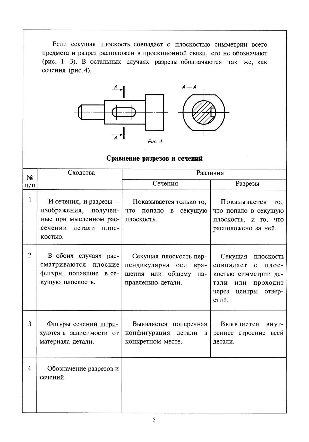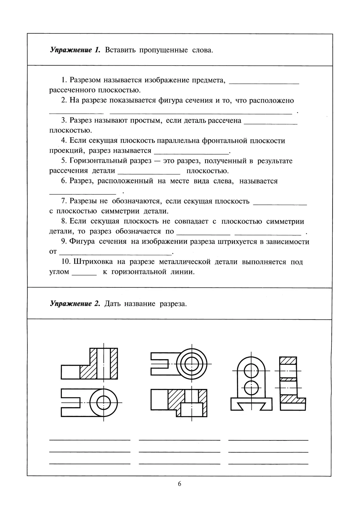 Рабочая тетрадь №6 знакомит учащихся с простыми разрезами и учит выполнению разрезов на комплексном и аксонометрическом чертежах.