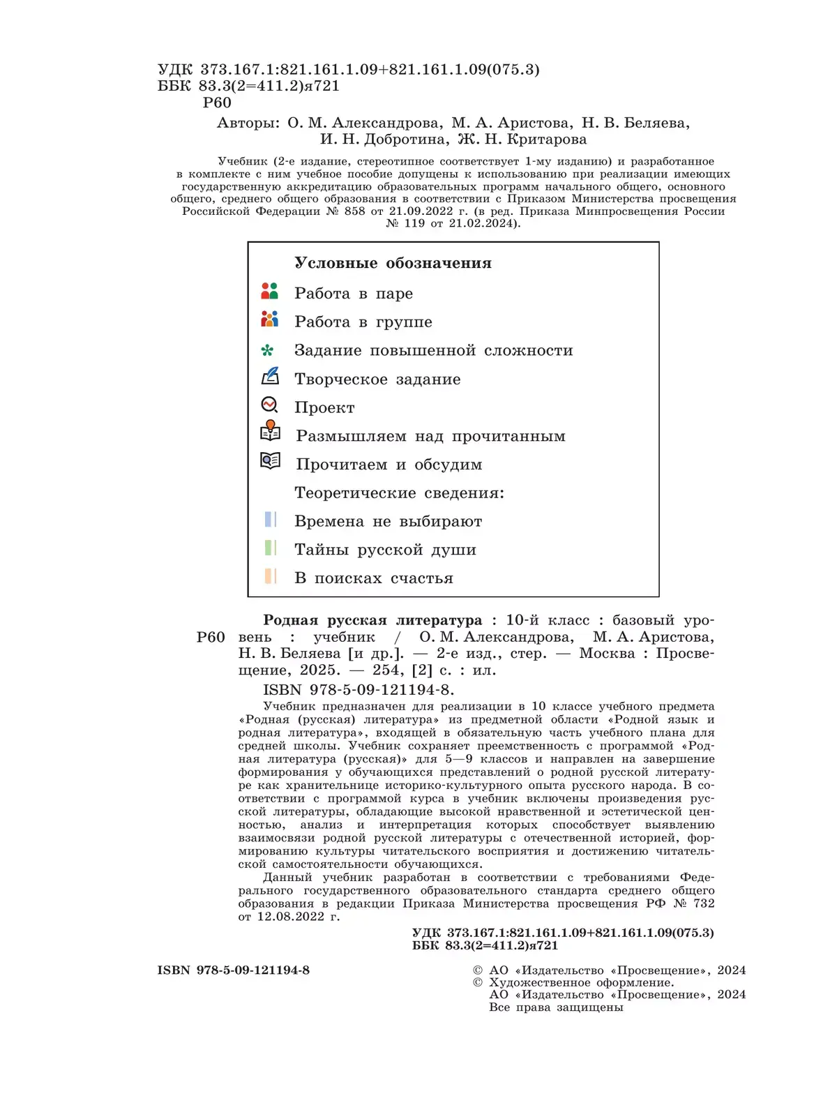 Учебник предназначен для реализации в 10 классе учебного предмета «Родная (русская) литература» из предметной области «Родной язык и родная литература», входящей в обязательную часть учебного плана для средней школы.
