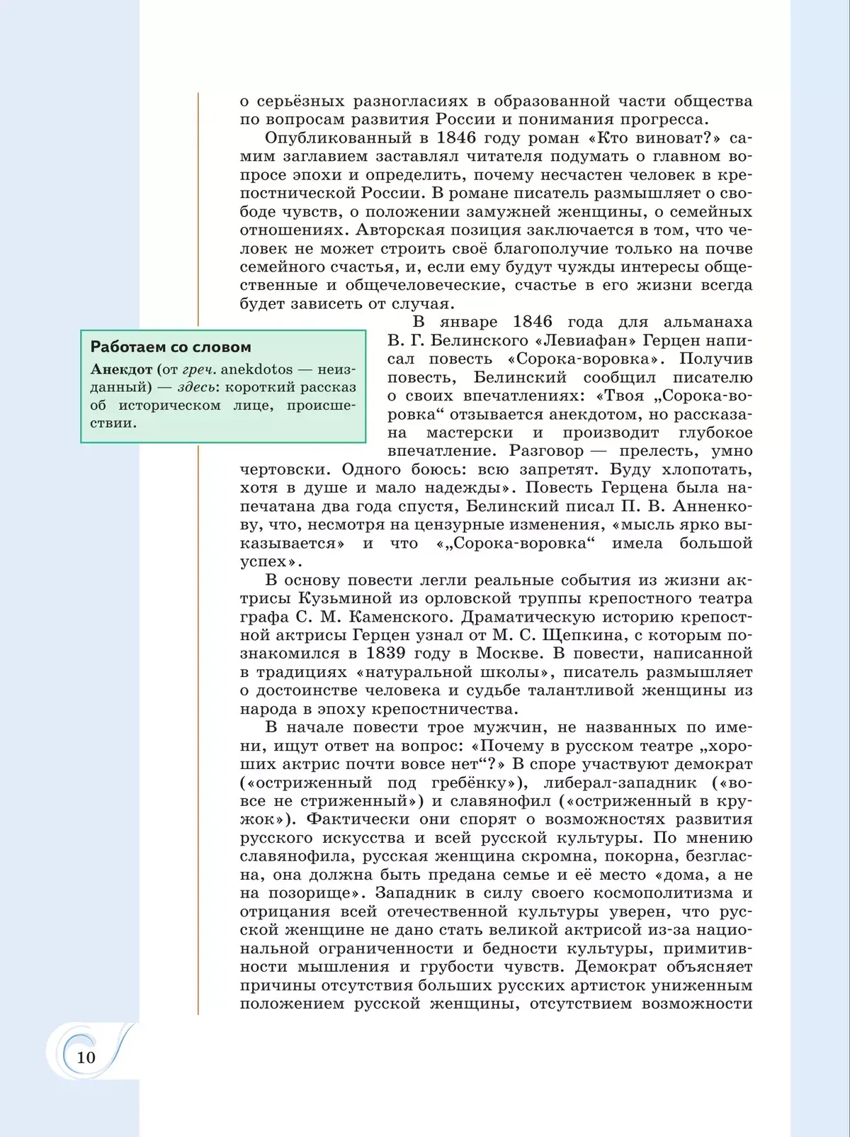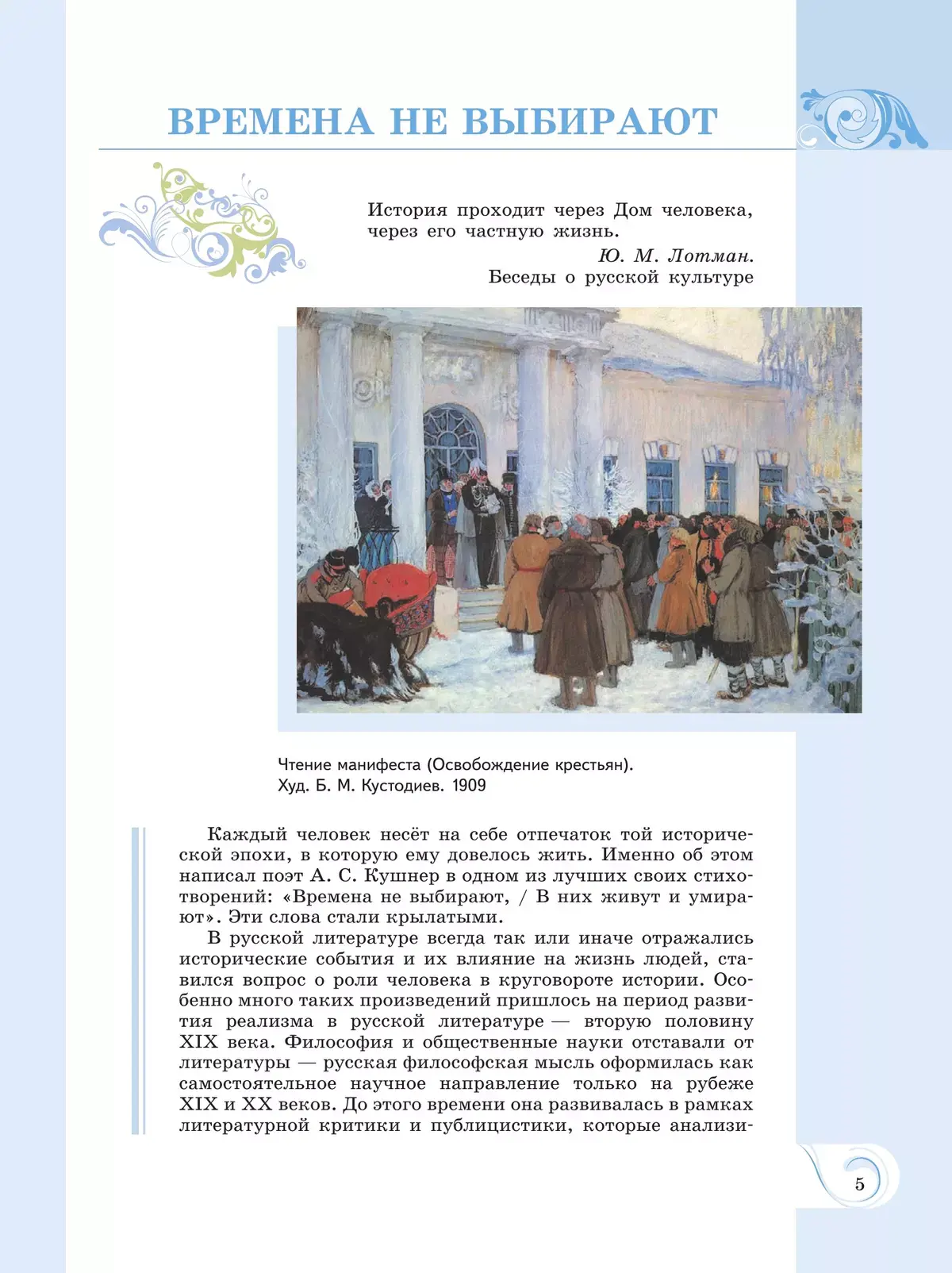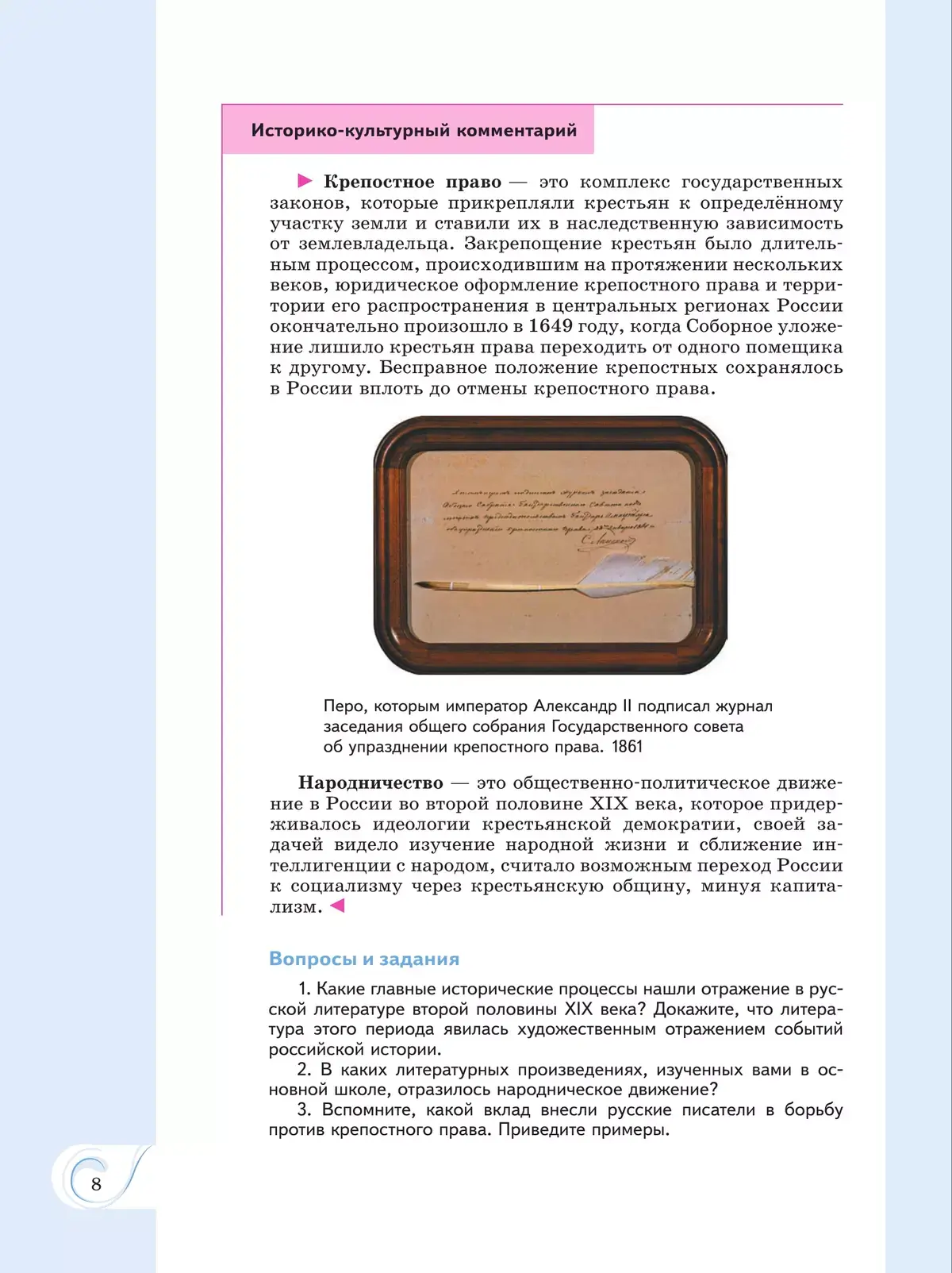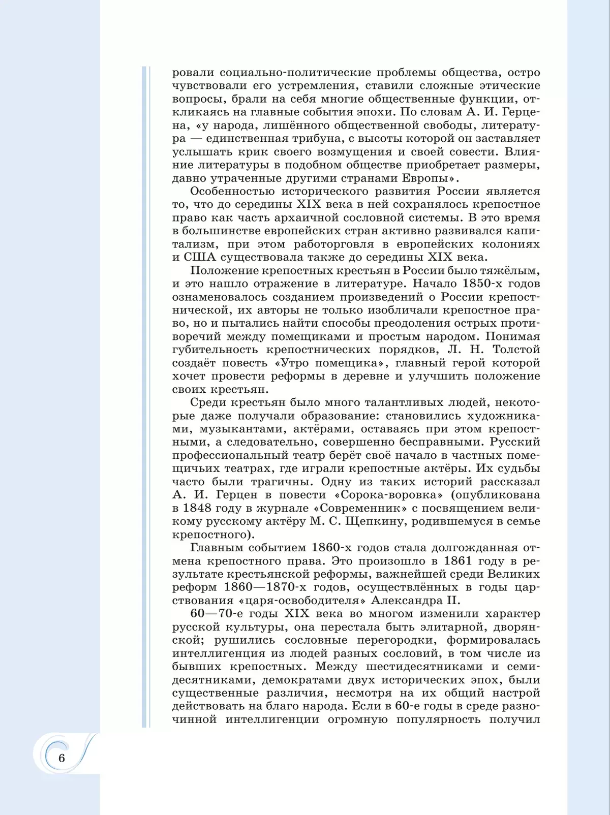 В соответствии с программой курса в учебник включены произведения русской литературы, обладающие высокой нравственной и эстетической ценностью, анализ и интерпретация которых способствуют выявлению взаимосвязи родной русской литературы с отечественной историей, формированию культуры читательского восприятия и достижению читательской самостоятельности обучающихся.