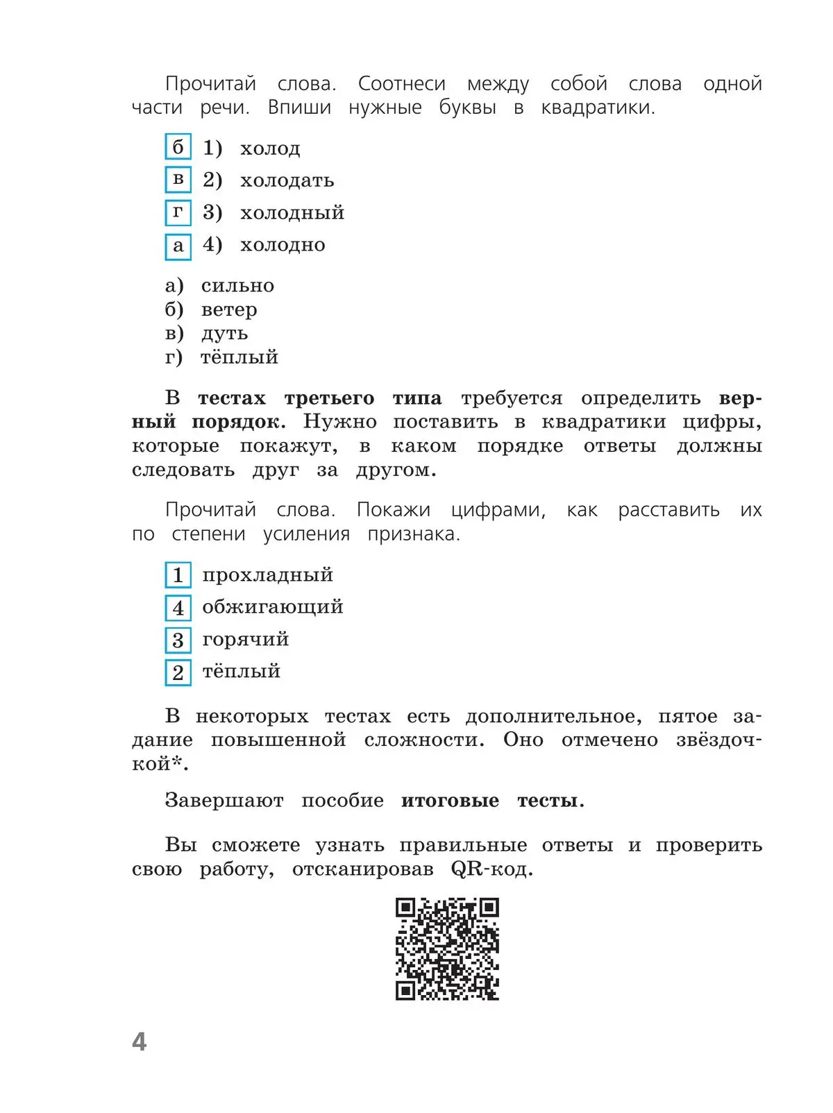 Структура пособия соответствует разделам учебника. Тестовый материал ориентирован на диагностику планируемых результатов для 4 класса по русскому языку.
