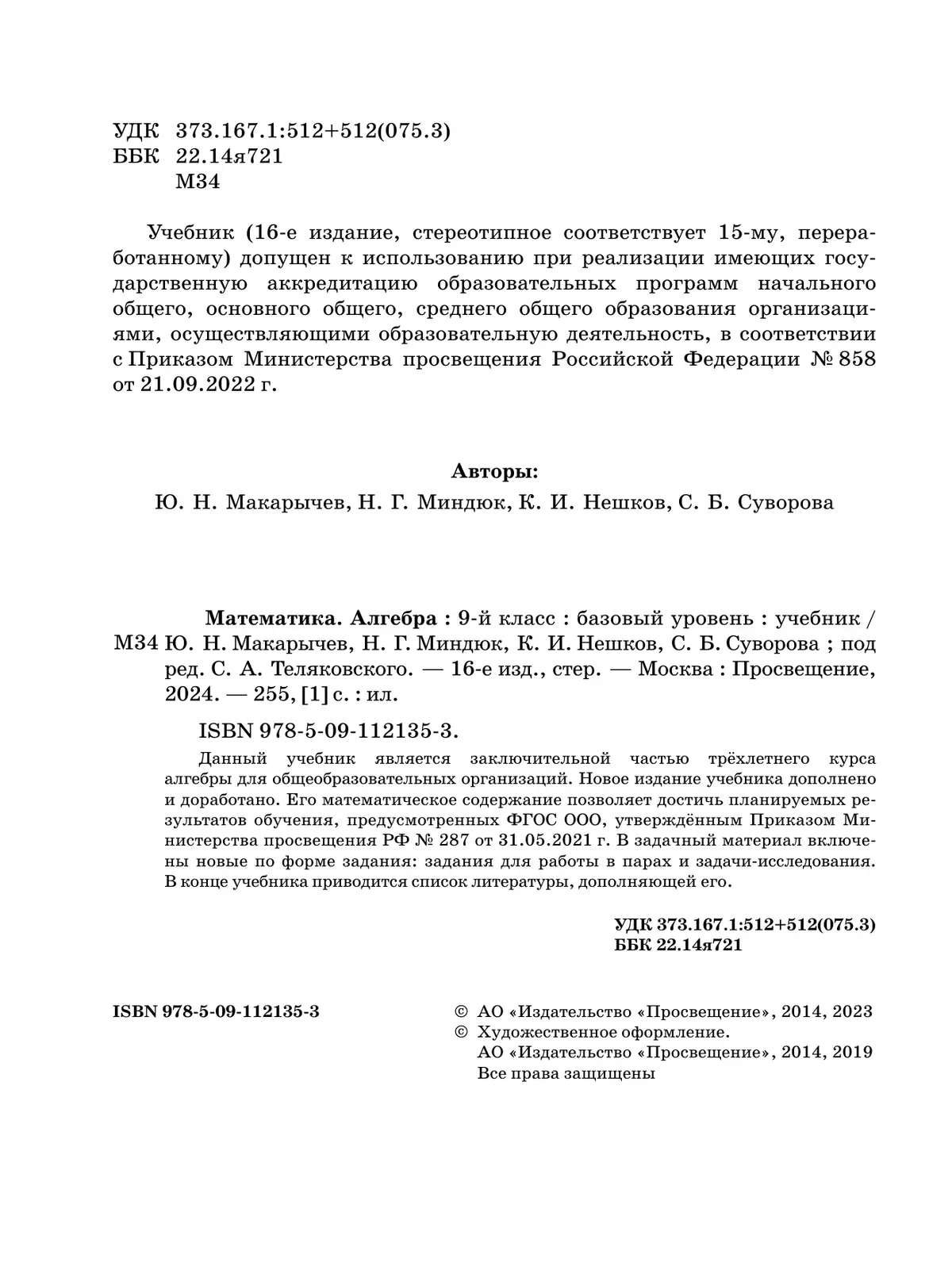 Учебник соответсвует ФГОС 2021 г. Данный учебник является заключительной частью трёхлетнего курса алгебры для общеобразовательных организаций. Новое издание учебника дополнено и доработано.