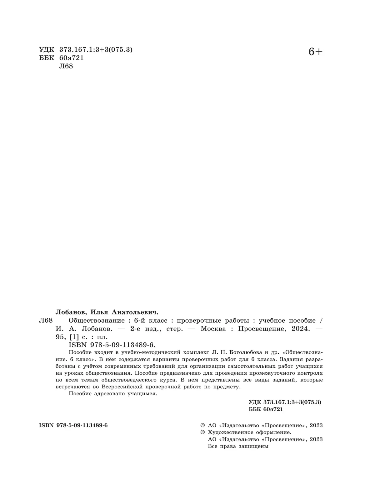 Пособие входит в учебно-методический комплект Л. Н. Боголюбова и др. «Обществознание. 6 класс». В нём содержатся варианты проверочных работ для 6 класса.