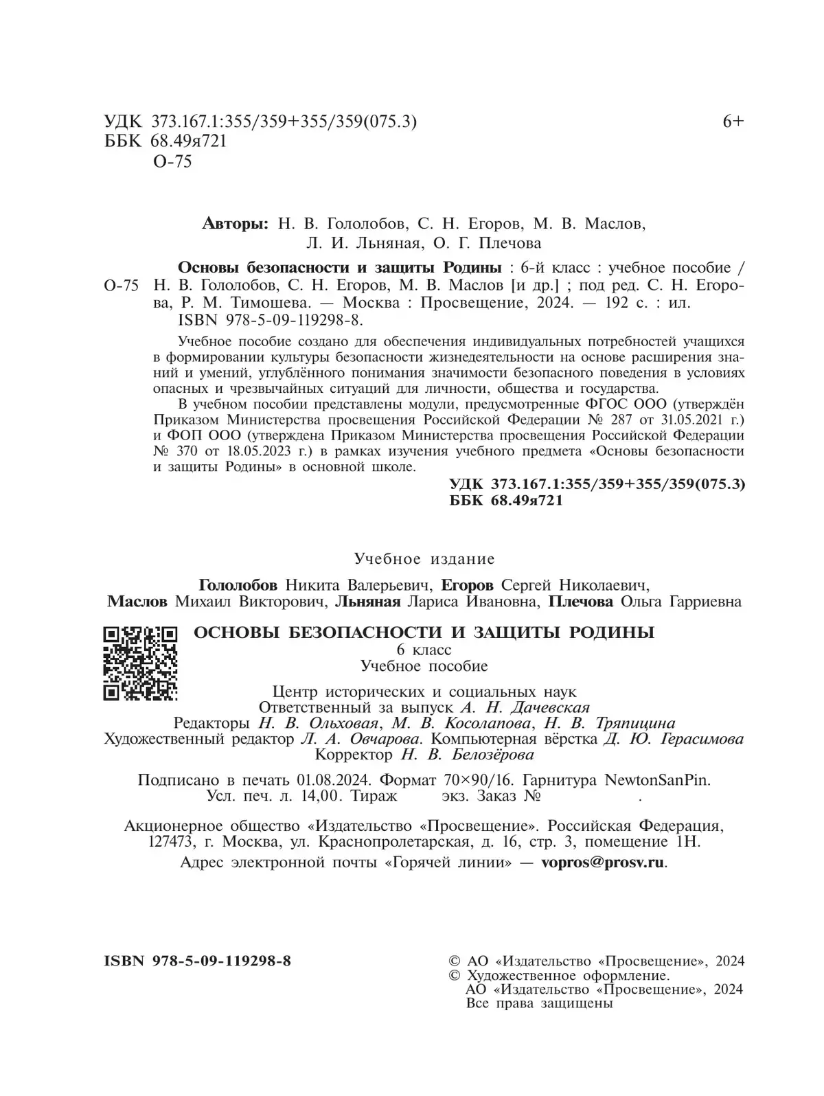 В учебном пособии представлены модули, предусмотренные ФГОС ООО (утверждён Приказом Министерства просвещения Российской Федерации № 287 от 31.05.2021 г.) и ФОП ООО (утверждена Приказом Министерства просвещения Российской Федерации от 18.05.2023 г.) в рамках изучения учебного предмета «Основы безопасности и защиты Родины» в основной школе.