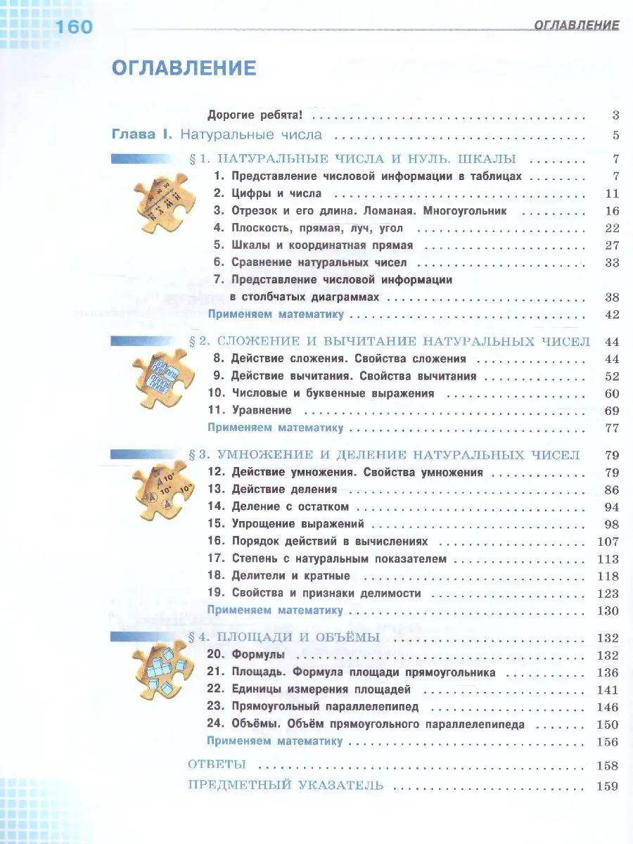 Первая часть посвящена изучению натуральных чисел и знакомству с начальными сведениями из геометрии. Учебник имеет большую и хорошо организованную систему заданий, подразделяющуюся на три основные группы: для работы в классе, для повторения ранее пройденного материала и для домашней работы.