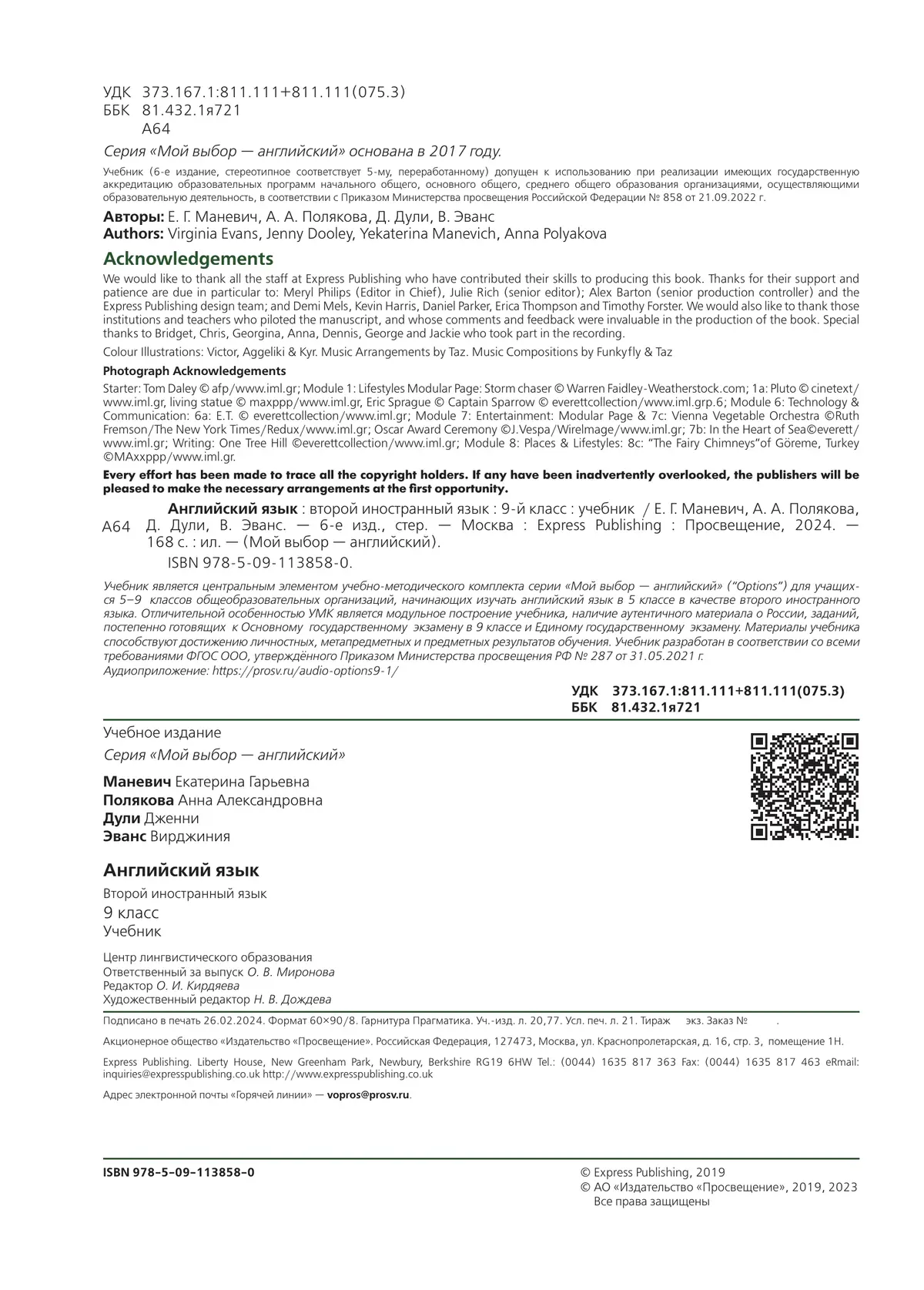 Учебник соответсвует ФГОС 2021 г. Учебник является центральным элементом учебно-методического комплекта серии «Мой выбор – английский!» (“Options”) для учащихся 5–9 классов общеобразовательных организаций, начинающих изучать английский язык в 5 классе в качестве второго иностранного языка.