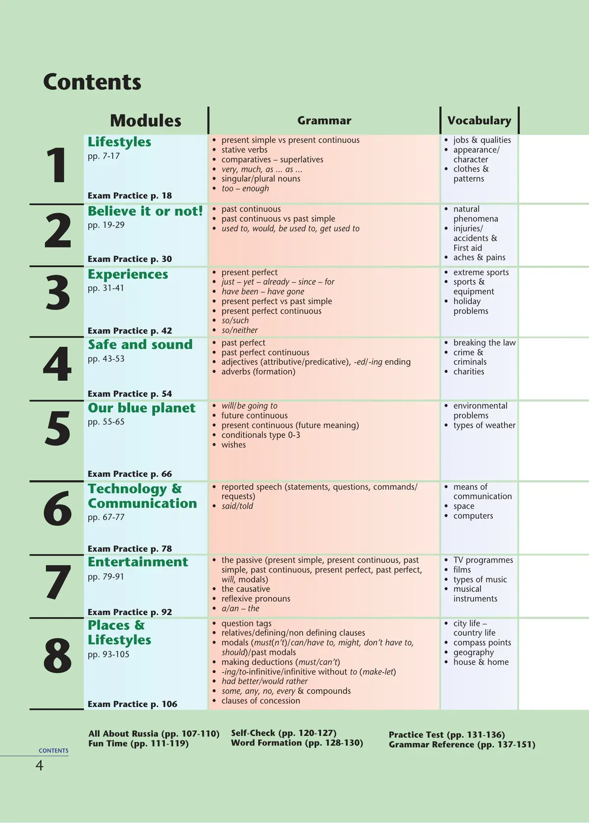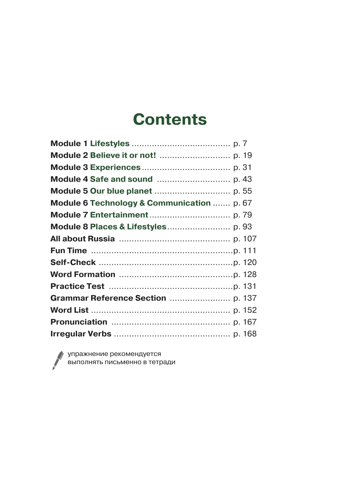 Отличительной особенностью УМК является модульное построение учебника, наличие аутентичного материала о России, заданий, постепенно готовящих к Основному государственному экзамену в 9 классе и Единому государственному экзамену.