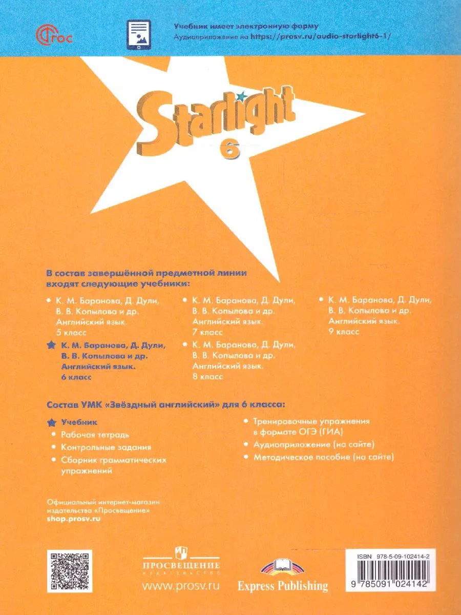 Учебник соответсвует ФГОС 2021 г. Учебник является центральным элементом учебно-методического комплекта серии «Звёздный английский» для учащихся 6 класса общеобразовательных организаций и школ с углублённым изучением английского языка.