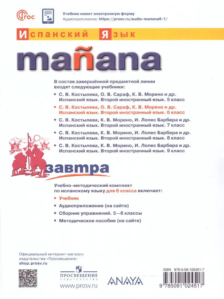 Учебник соответсвует ФГОС 2021 г. Учебник «Испанский язык. Второй иностранный язык. 6 класс» серии “Mañana” («Завтра») создан совместно с испанским издательством «Анайя» и предназначен для учащихся общеобразовательных организаций, начинающих изучать испанский язык в качестве второго иностранного языка с 5 класса.
