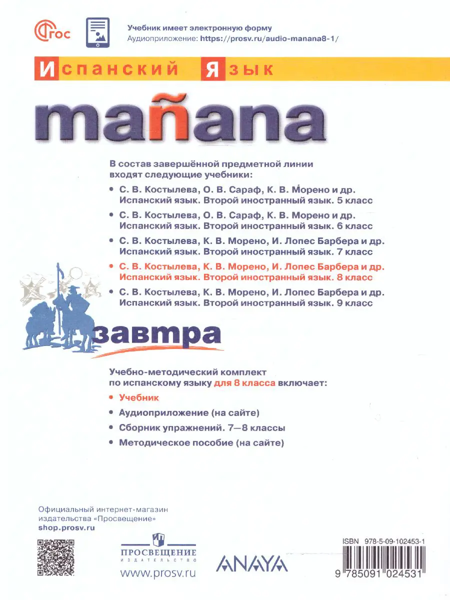 Учебник соответсвует ФГОС 2021 г. Учебник «Испанский язык. Второй иностранный язык. 8 класс» серии “Mañana” («Завтра») создан совместно с испанским издательством «Анайя» и предназначен для учащихся общеобразовательных организаций, начинающих изучать испанский язык в качестве второго иностранного языка с 5 класса.