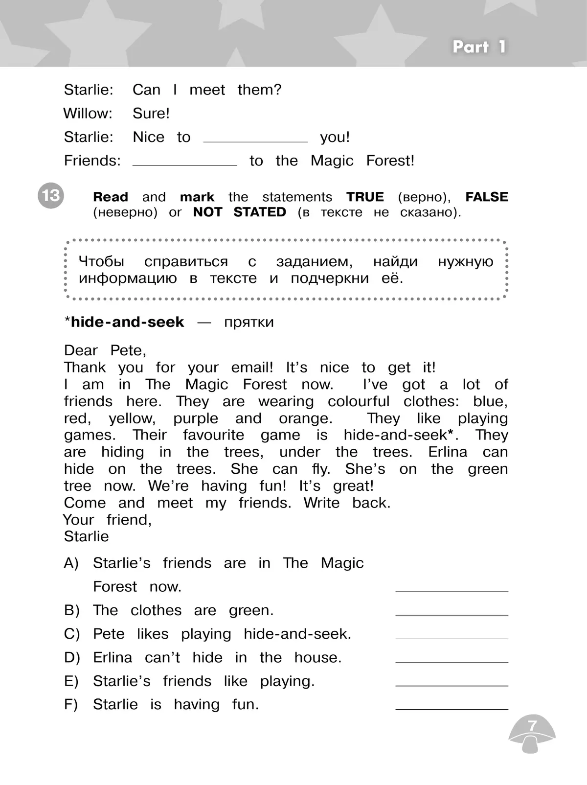 Помощник Starlie, житель Английской Звезды, переписывается с ребятами, рассказывает о своих встречах, увлечениях, семье и просит быть внимательным, читая письма и беседы – такие задания готовят младших школьников к успешному выполнению диагностических работ, которые проверяют, прежде всего, читательскую грамотность учащихся.