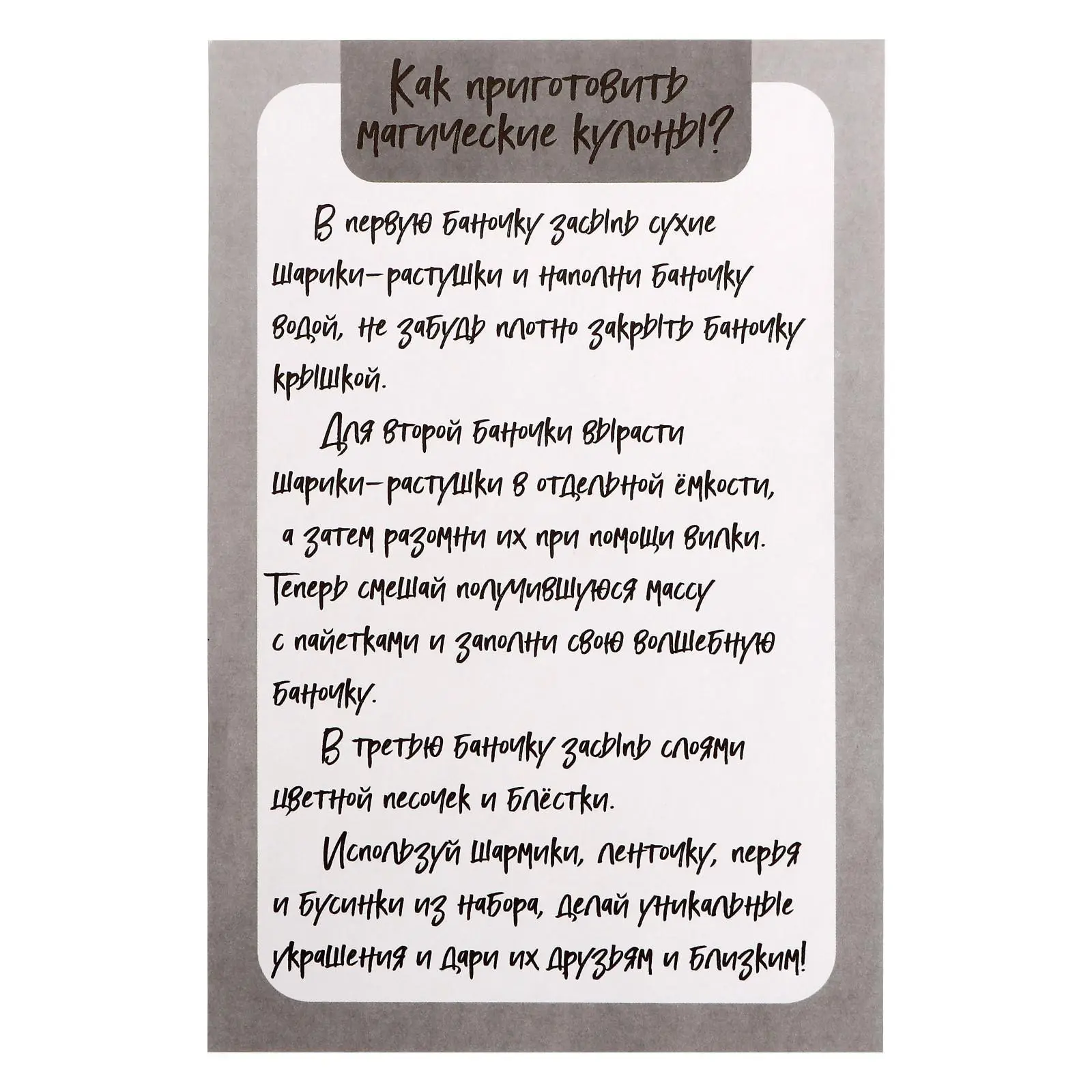 С набором «Создай своё украшение» у ребёнка получится самостоятельно изготовить подвески с секретным содержимым. Для этого нужно внимательно познакомиться с инструкцией и подключить фантазию. Декорируйте мини-баночки по своему усмотрению, и у вас получится три уникальных кулона.