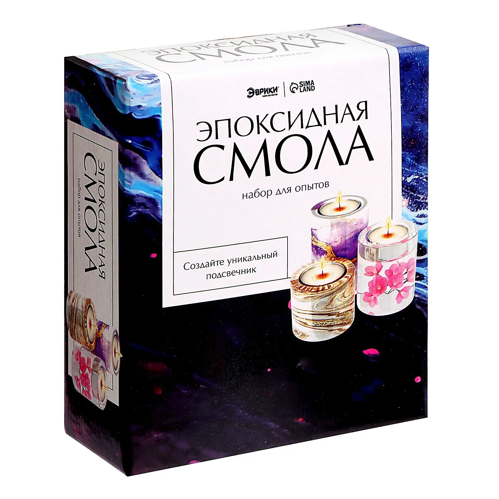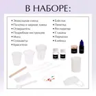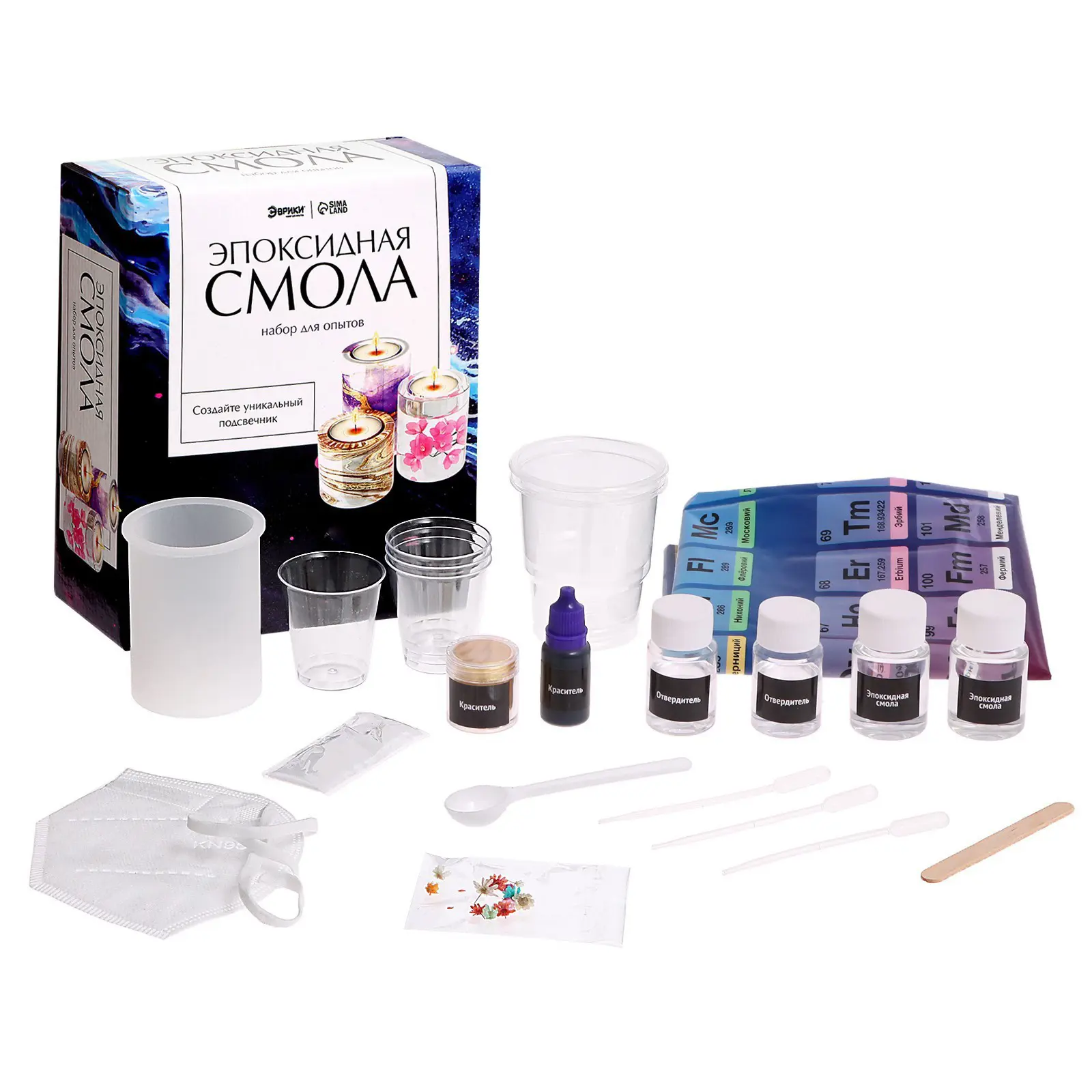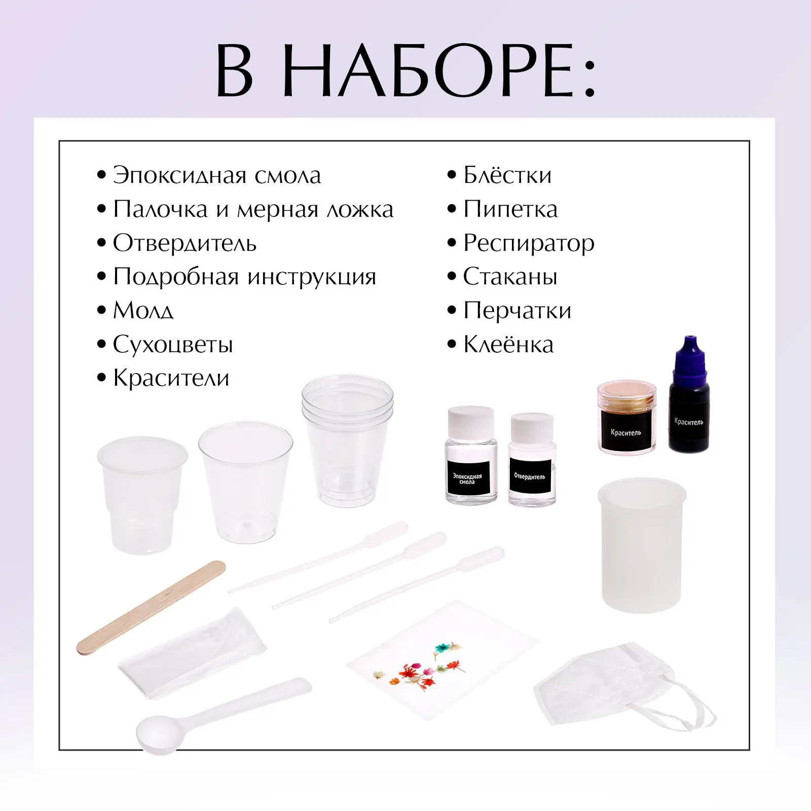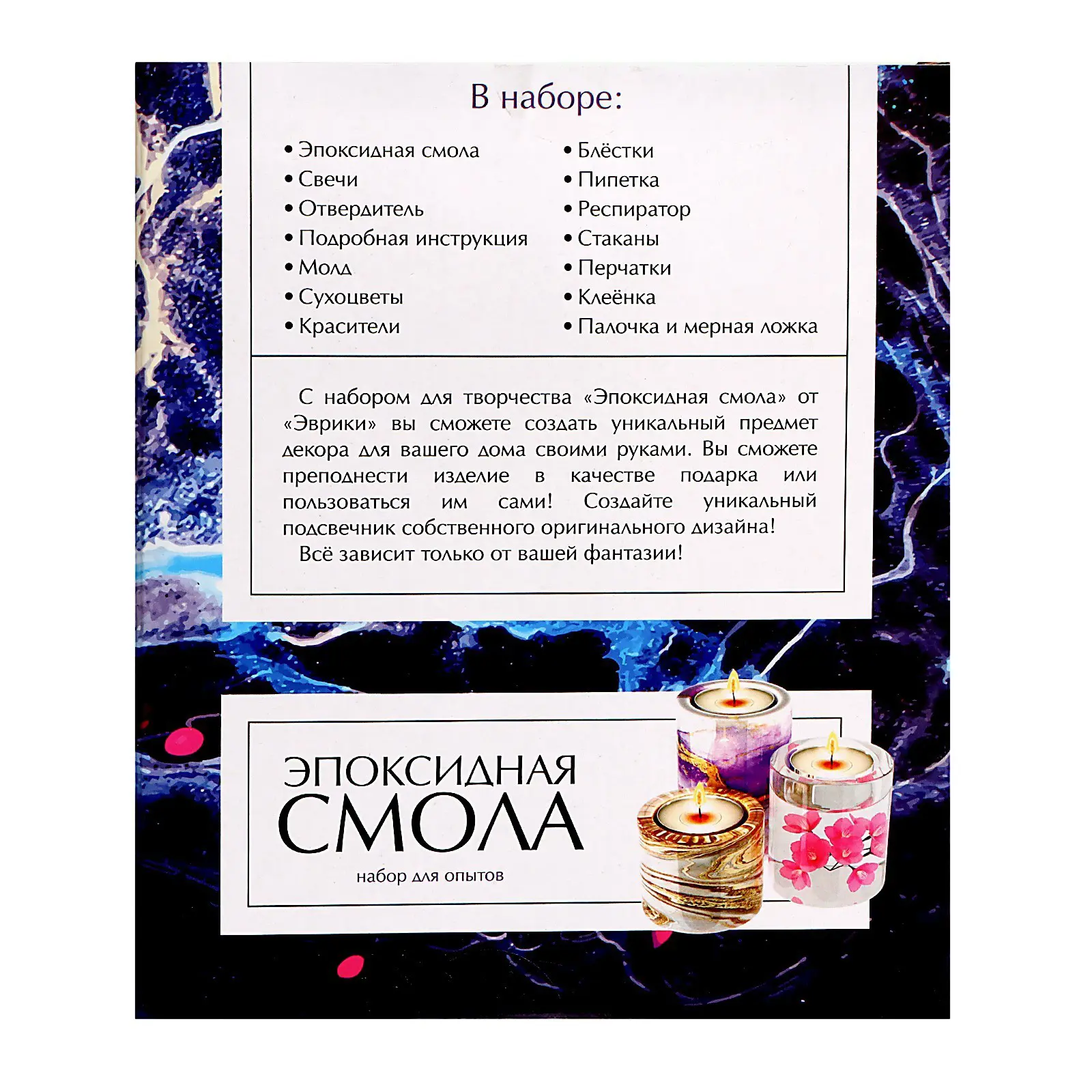 в комплекте вы найдёте необходимые инструменты и материалы: смолу, свечи, сухоцветы, отвердитель, инструкцию, молды, красители, блёстки, пипетку, респиратор, стаканы, перчатки, клеёнку, палочку, мерную ложку и силиконовую форму;