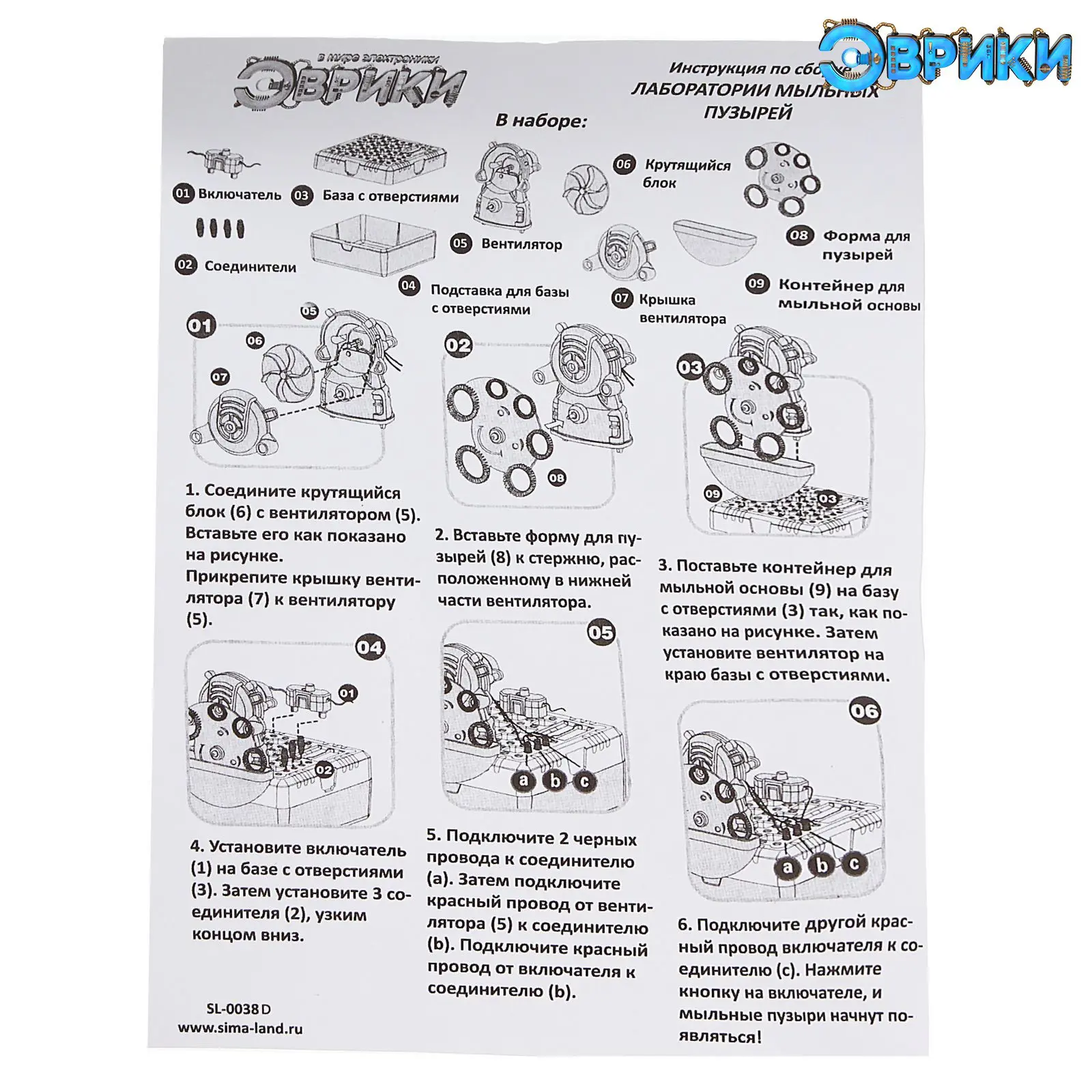 Соедините крутящийся блок с вентилятором, следуя указаниям инструкции. Поставьте контейнер для мыльной основы на базу с отверстиями. Подключите провода. Нажмите на кнопку включателя и наслаждаетесь появлением мыльных пузырей.