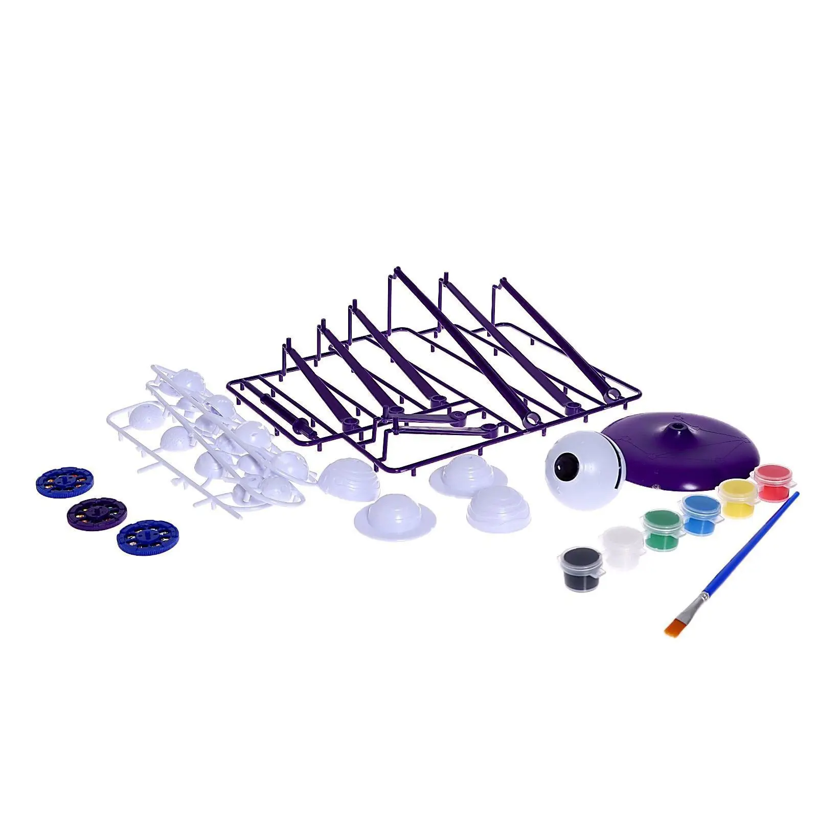 соберите планеты и раскрасьте их кисточкой, ориентируясь по рисунку на упаковке. Установите готовые планеты на специальный держатель — и модель Солнечной системы готова!
