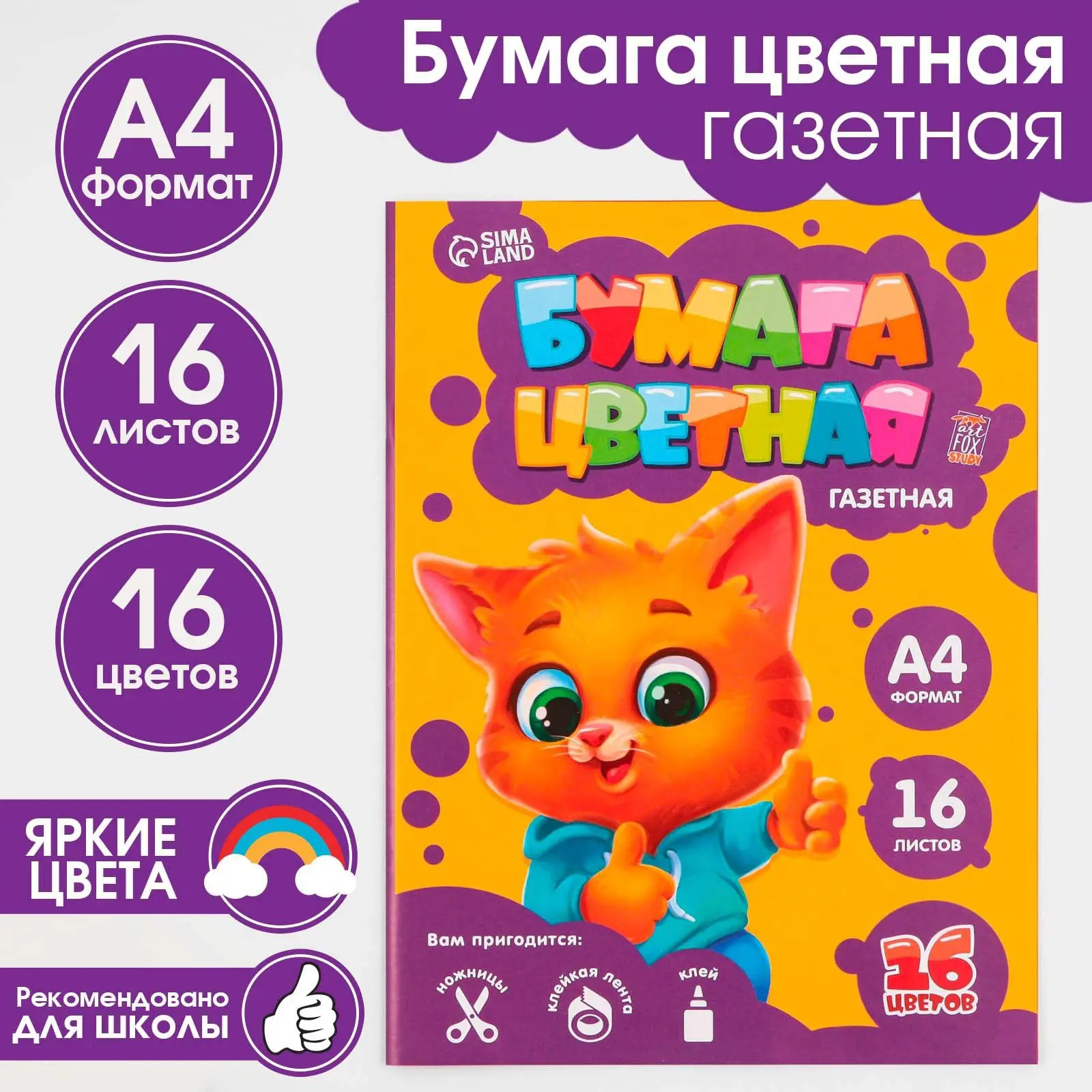 Бумага цветная А4, 16 л., 16 цв., газетная, односторонняя, на скобе. 1 сентября:Котик