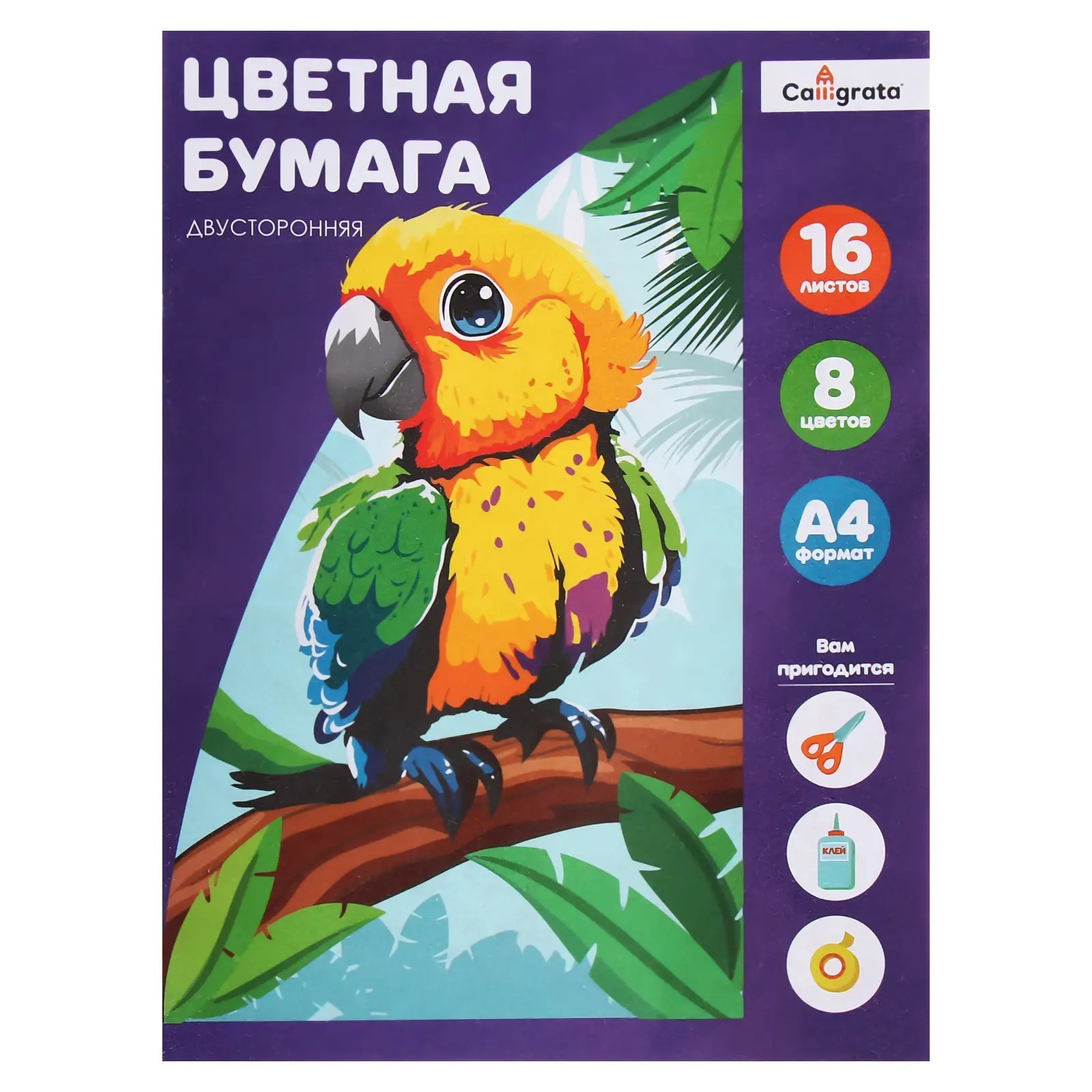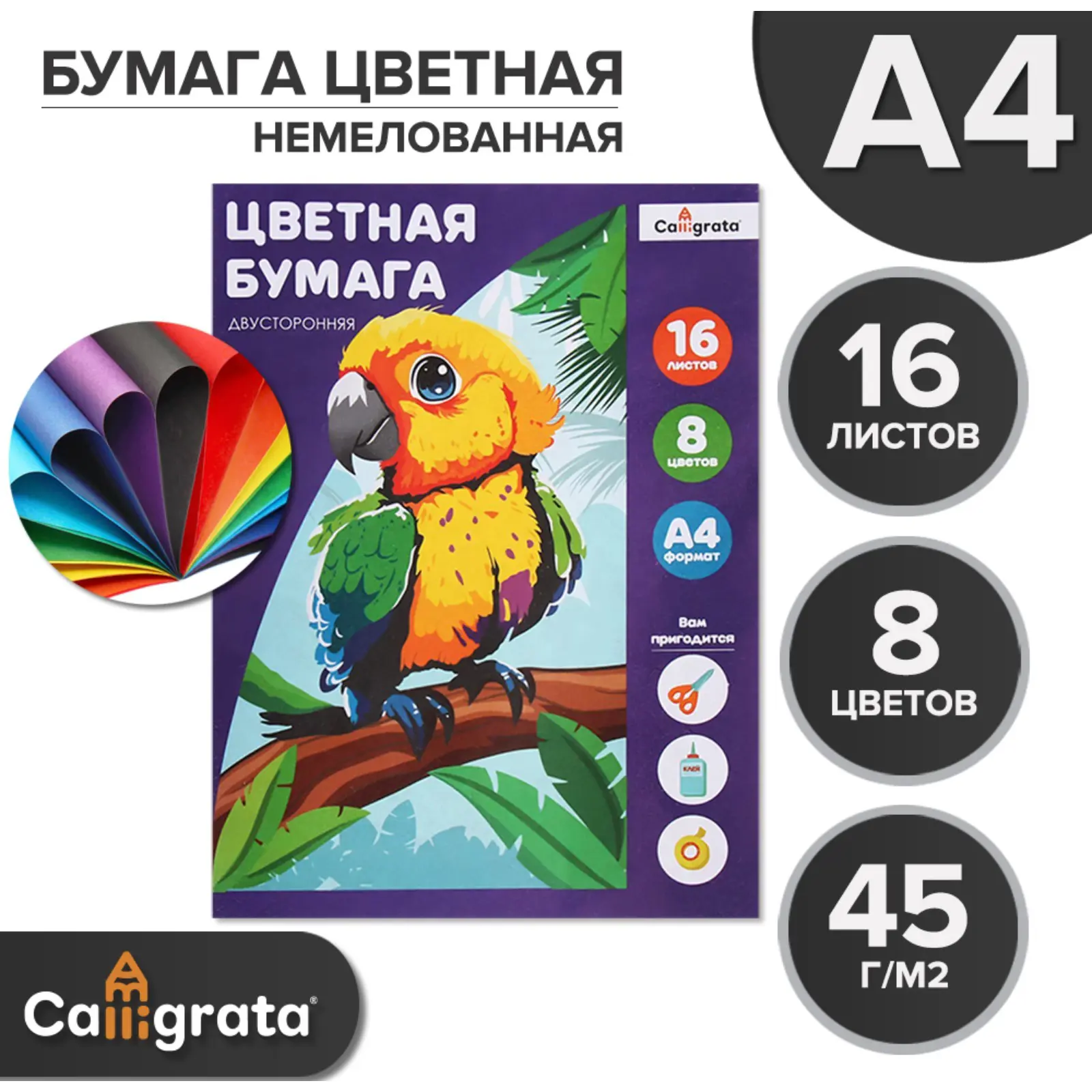 Бумага цветная А4, 16 л., 8 цв., газетная, двусторонняя, на скобе. Calligrata
