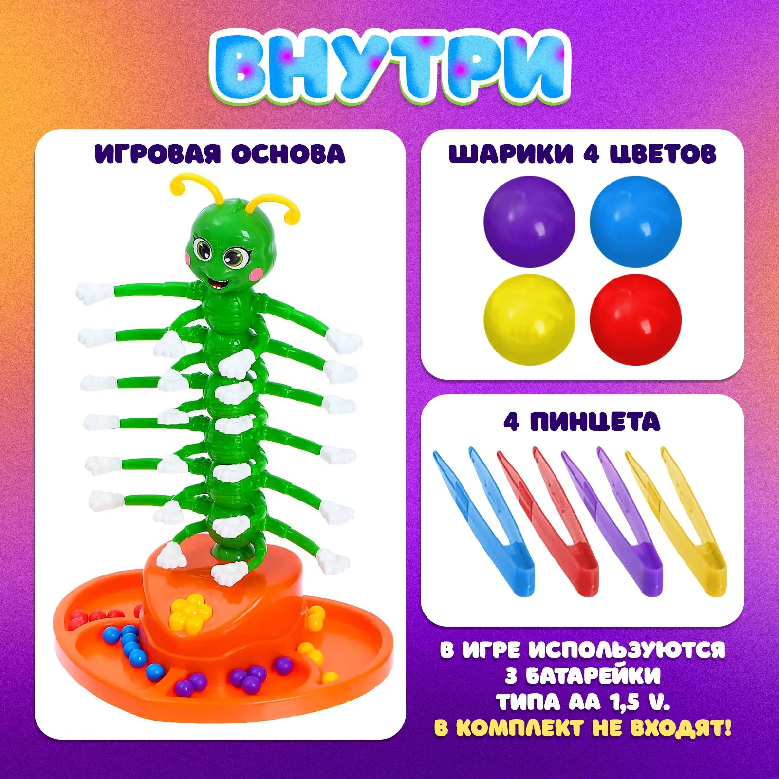 "Кручу-верчу" — настольная игра для детей от 4 лет. Талантливая и артистичная гусеничка Пипси готовится к концерту цирковых артистов. Малышу предстоит проявить ловкость и помочь милой букашке победить на шоу жонглёров. Подготовка к игре: Каждый игрок берёт по пинцету, выбирает шарики одного цвета и кладёт их в ближайшую к себе ячейку. Включите игровой модуль, нажав на кнопку, и гусеница начнёт танцевать под весёлую музыку. Ход игры: Игроки по очереди кладут на лапки гусеницы по одному шарику с помощью пинцета. Если ваш шарик упал, положите его обратно в свою ячейку. Действие переходит к следующему игроку. Выигрывает тот, кто первым избавится от всех своих шариков. Игра на баланс улучшит координацию движений и прокачает моторику.