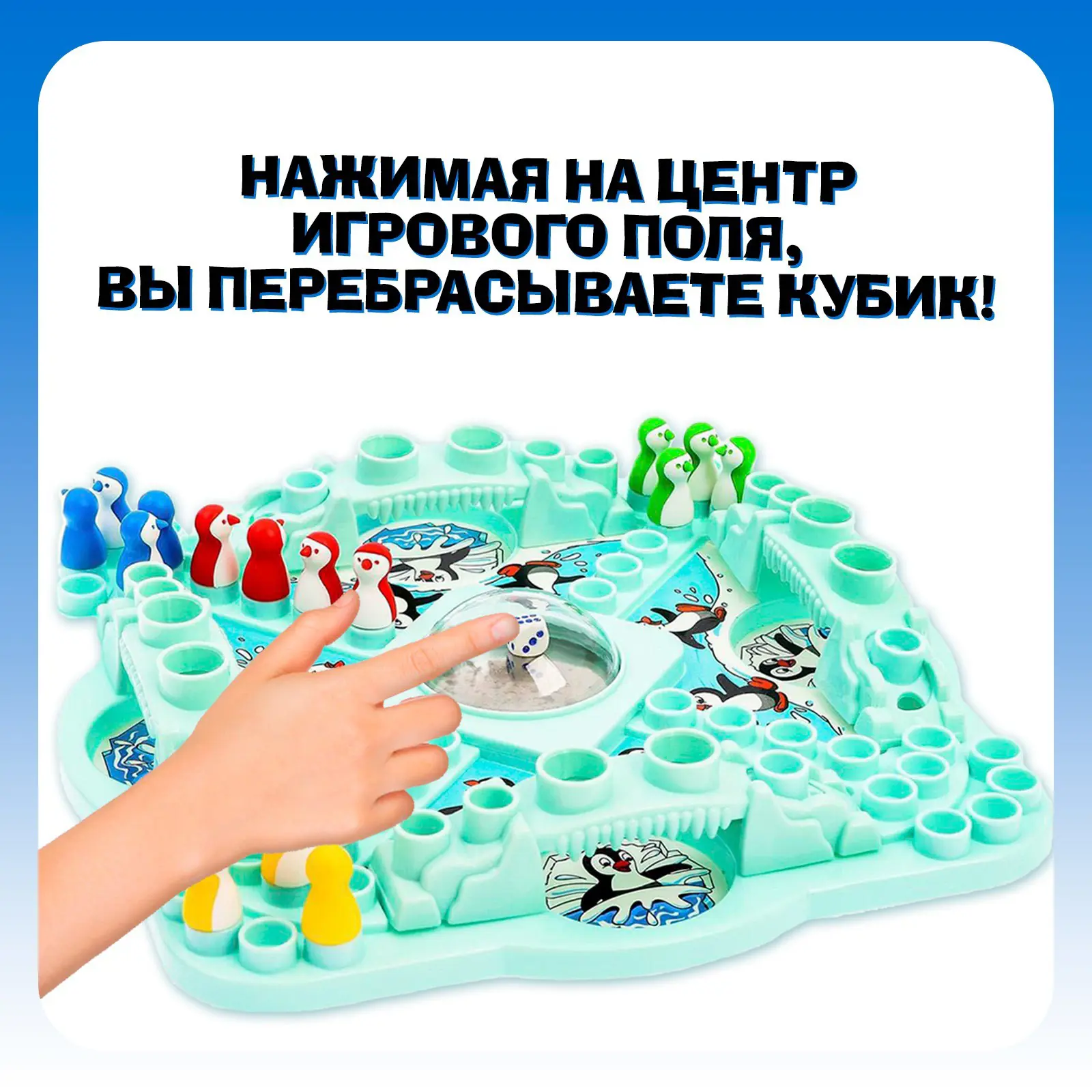 Соберите игровое поле по инструкции, выберите себе семью пингвинов и поставьте их в угол на 4 ячейки. Далее игроки ходят по очереди: кидают кубик и передвигают одного пингвина за ход на столько ячеек по часовой стрелке, сколько выпало на кубике. Потом ход переходит к следующему игроку.