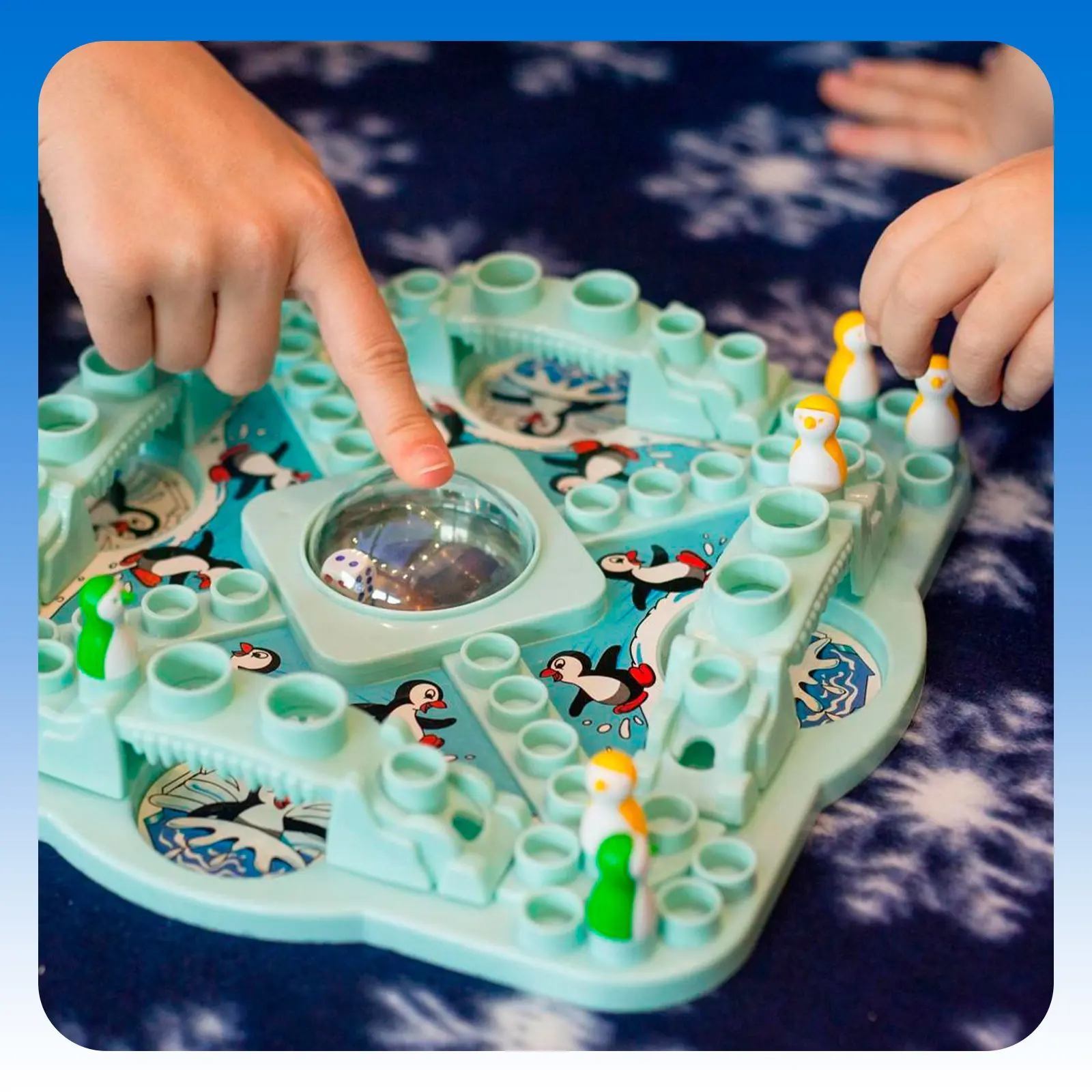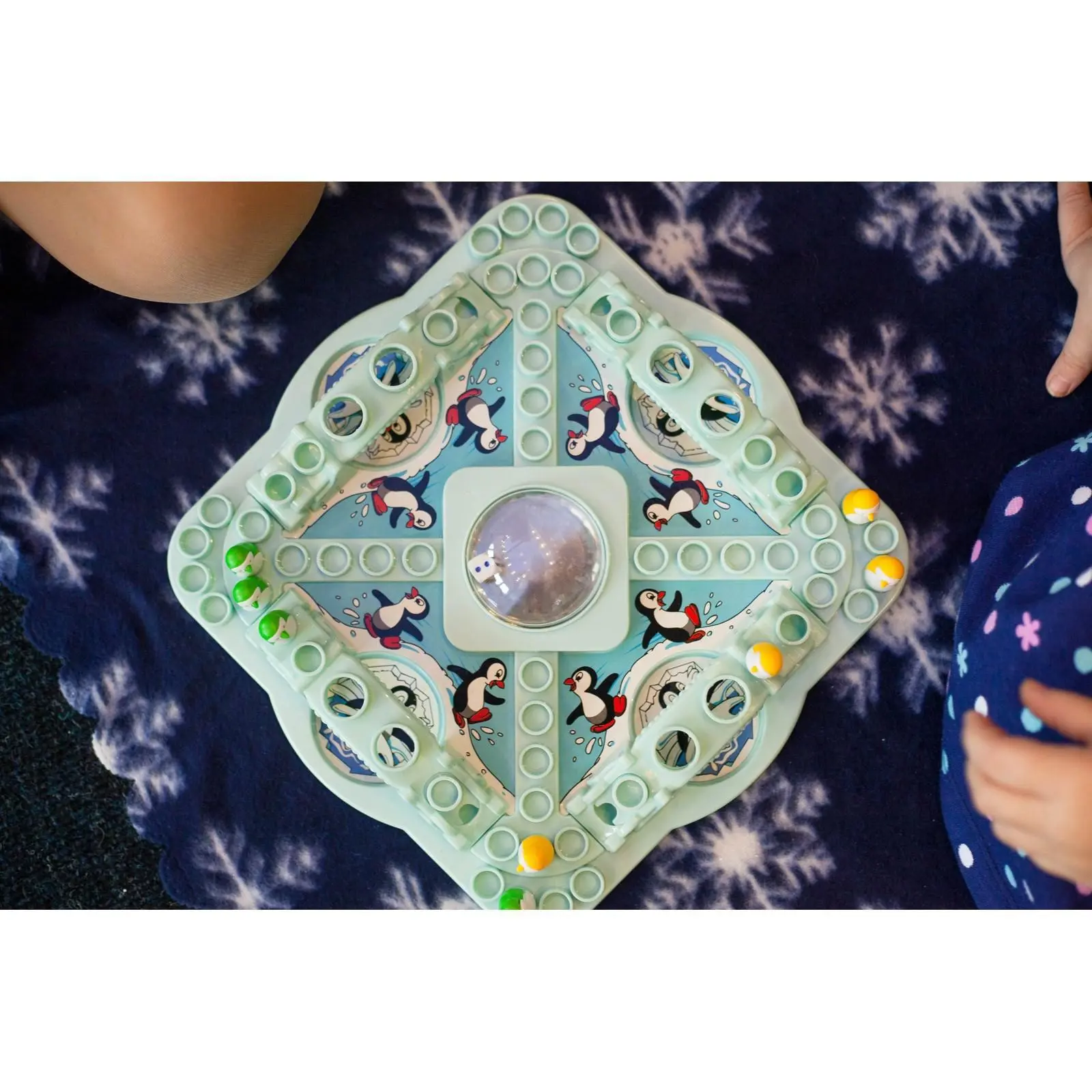 Ваша цель – провести всех пингвинов по кругу и поставить их на ячейки около кубика. Но будьте осторожны – старайтесь не попадать на скользкие мосты! Если ваш пингвин в конце хода остался на двух больших ячейках моста – на льду – он может упасть! Теперь другие игроки, проходящие через эту же ячейку, могут столкнуть вашего пингвина под мост. Если ваш пингвин упал с моста, он должен вернуться на исходную позицию и начать заново. Снова ввести его в игру можно лишь тогда, когда на кубике выпадет 6 точек.