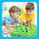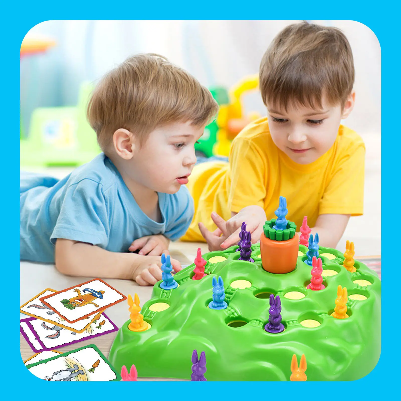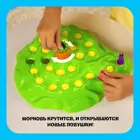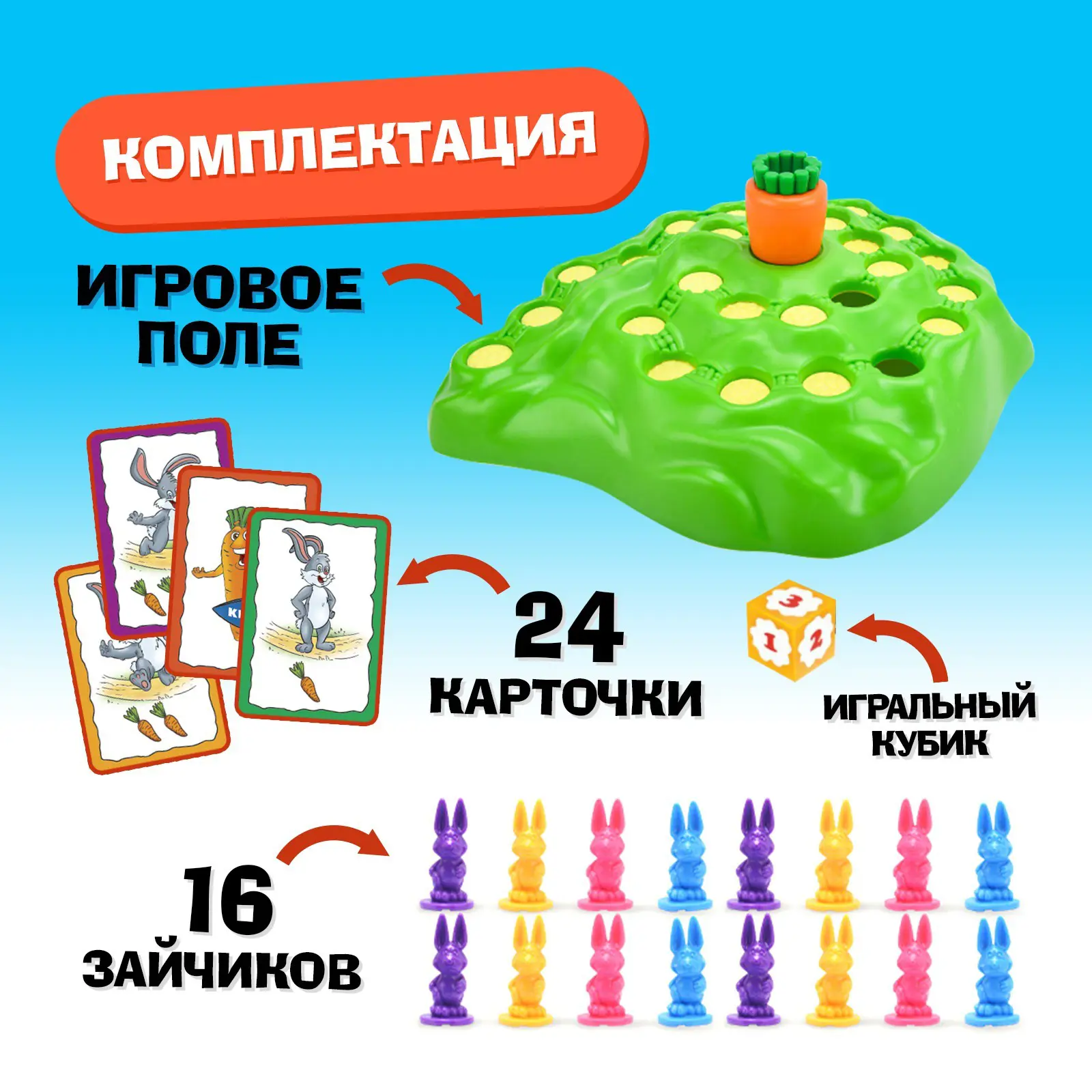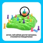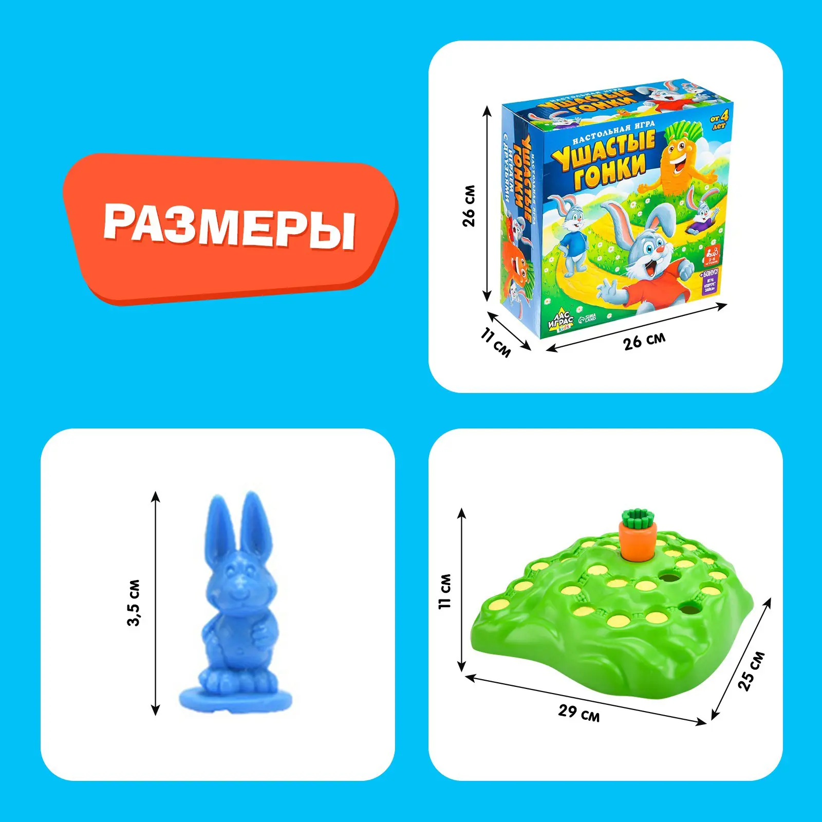 Веселая семейная настольная игра Ушастые гонки – эти ХИТ продаж среди детских настольных игр ходилок - бродилок Игра ходилка подходит для детей 3 лет, 4 лет и детей, которые только начинают играть в настольные игры ( также прекрасно подойдет в качестве первой настольной игры для малышей), так и дошкольникам 5, 6, 7 лет, школьникам, взрослым. Игра рассчитана на компанию от 2 до 4 игроков. Цель игры настолки – первым дойти до морковки, которая растет на верху холма. Используйте пластиковое игровое поле и карточки ходов. Игроки по очереди переворачивают карты и делают шаги. Если попалась карточка с зайчиком, то игрок делает столько шагов, сколько изображено кочек на карточке (считаются только пустые клетки поля, на которых не стоят зайчики). Если выпала карточка с морковкой, то игрок крутит морковку и в это время чьи-то зайчики могут пострадать (провалиться в открывшиеся лунки или быть скинуты с игрового поля). Игроки, чьи зайчики пострадали, начинают путь заново уже новым зайчиком. Данную детскую настольную игру ходилку рекомендуем рассмотреть в качестве подарка для детей 3, 4, 5, 6, 7 лет и старше на Новый год, День рождения, 23 февраля и 8 марта. Она отлично подойдет для детского сада, школы, детям начальных классов.