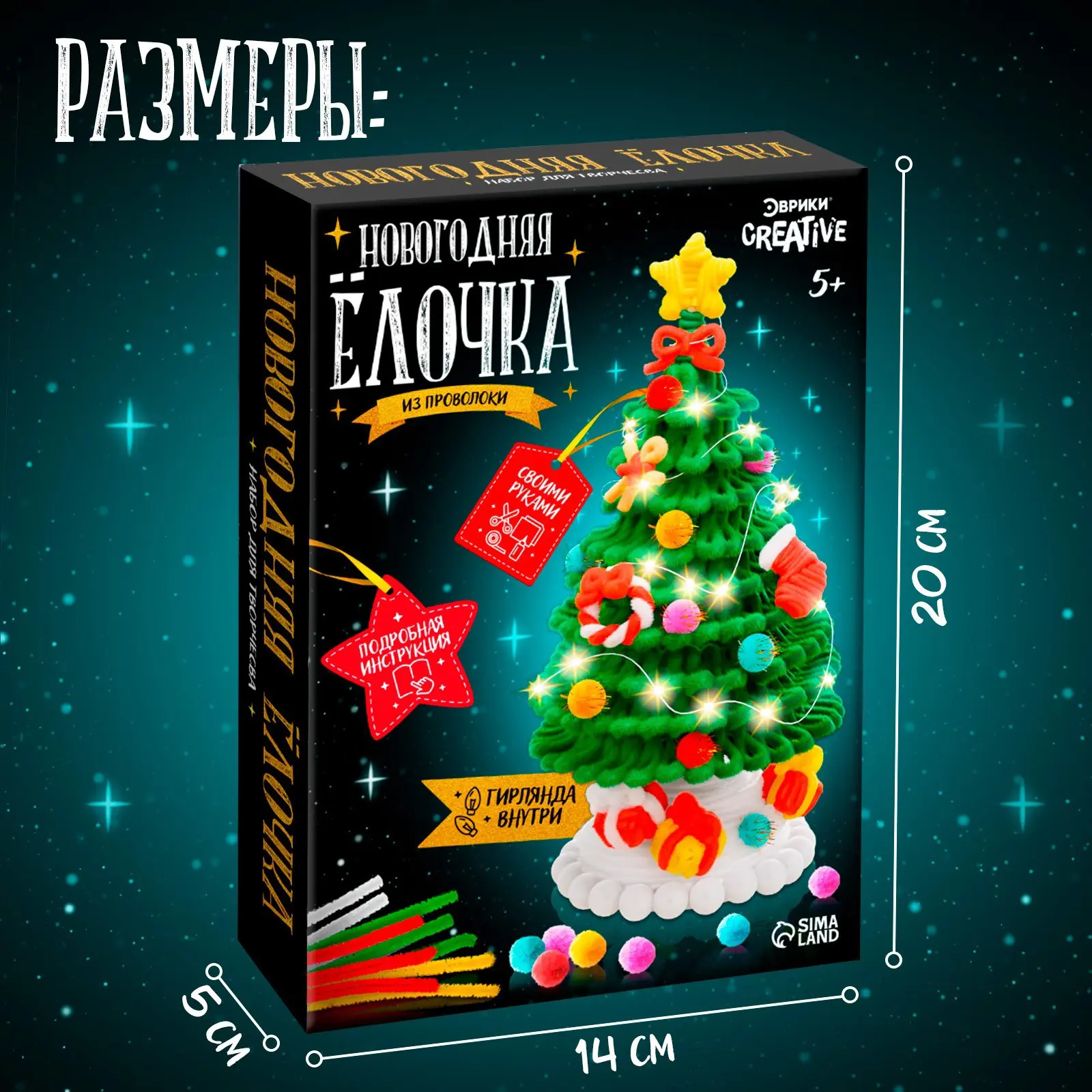 Набор рекомендован для детей от 5 лет. Комплектация: пушистая проволока, полусфера, помпошки, гирлянда, палочка, клей, перчатки, инструкция.