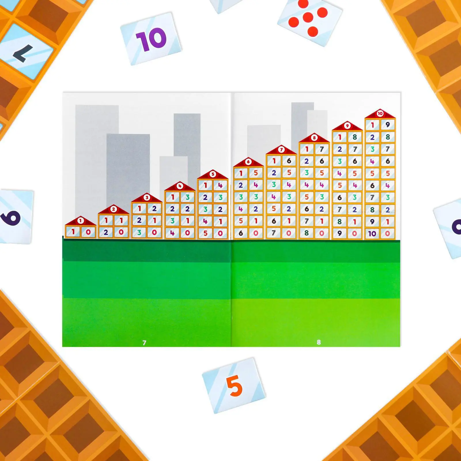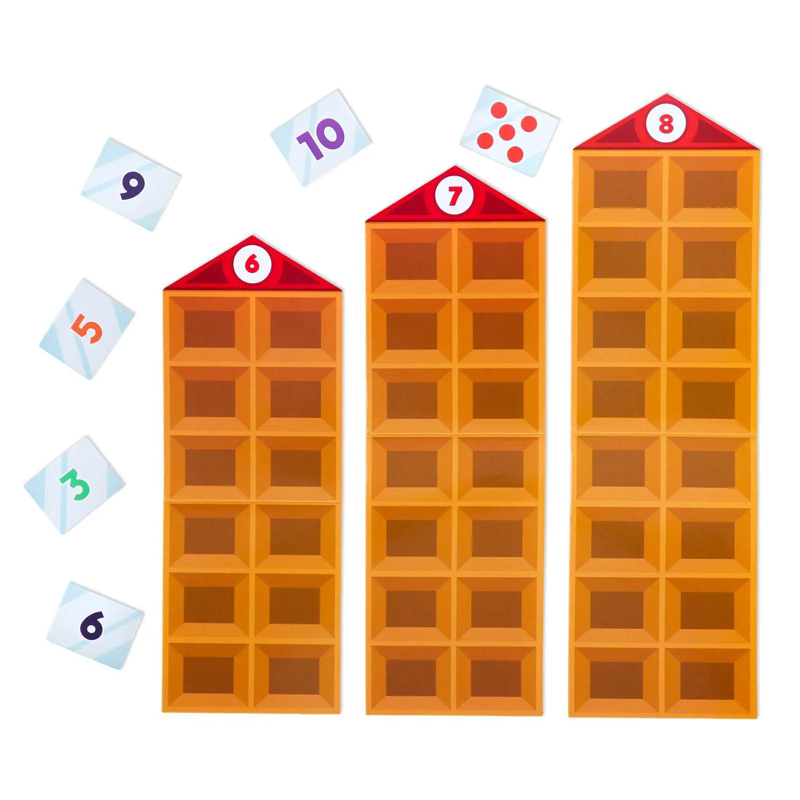 Внутри вы найдёте: 11 домиков разного размера, 33 карточки с цифрами, 18 карточек с точками, правила игры.