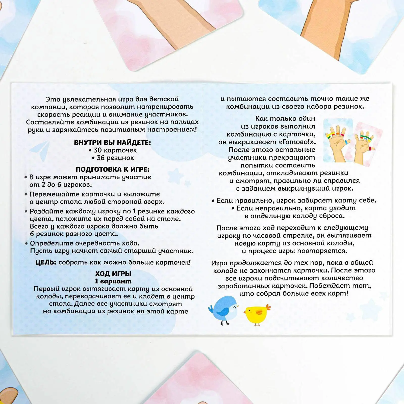 Внутри вы найдёте: 30 карточек; 36 резинок; правила игры. Весёлая игра для детской компании!