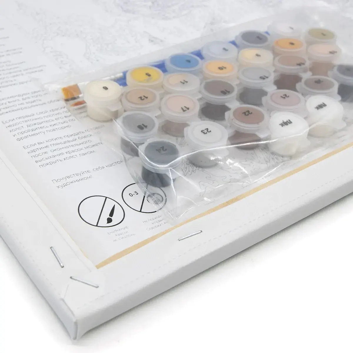 Состав набора: грунтованный холст, деревянный подрамник, комплект пронумерованных акриловых красок, набор кистей из эластичного нейлонового волокна, контрольный лист с нанесённой схемой, защитный лак.