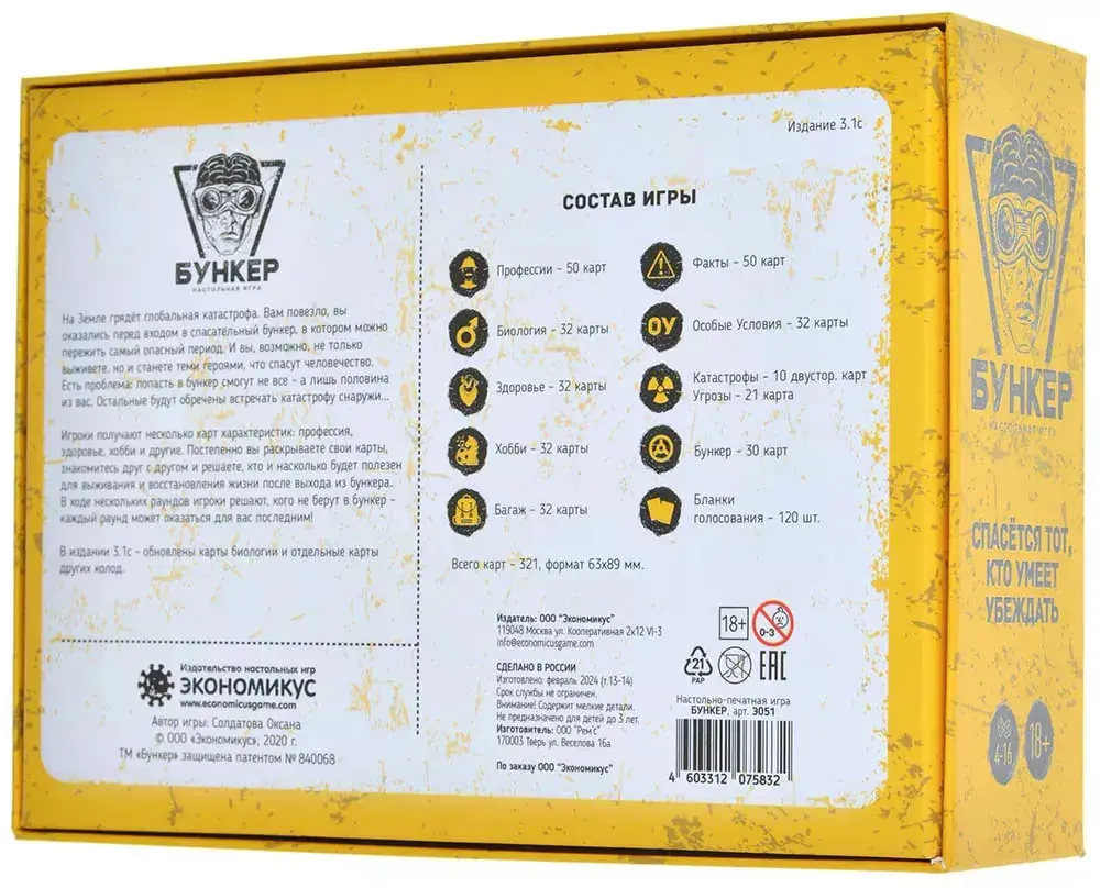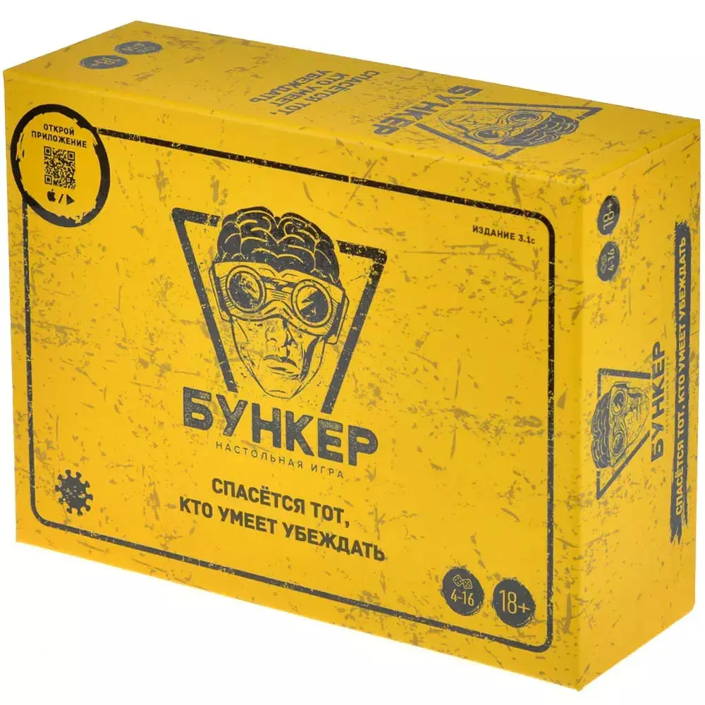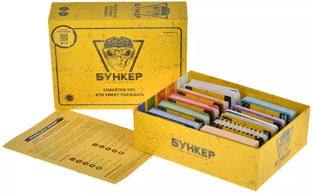 В настольной игре "Бункер" вам нужно будет убедить других игроков, что вас точно нужно взять в убежище, где очень ограниченное количество мест. В начале игры вы получаете карточки характеристик: пол и возраст, профессия, здоровье, хобби и другие. Постепенно раскрывая их в процессе игры, вы знакомитесь с друг другом и пытаетесь понять - кто достоин того, чтобы восстанавливать жизнь после конца эпохи?