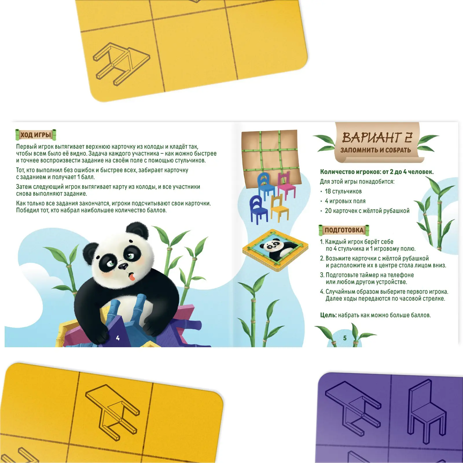 Эта игра познакомит ваших детей с объёмными предметами и их положениями в пространстве. Для этого понадобятся наши стульчики, которые они будут выкладывать на игровом поле. Вытягивайте карты, расставляйте стульчики, выполняйте задания и отлично проводите время в компании семьи и друзей! Игра развивает: внимание, память, пространственное мышление, мелкую моторику. Состав: 4 игровых поля; 30 карт с заданиями; 18 стульчиков; правила игры. Играйте и развивайтесь вместе с ЛАС ИГРАС!