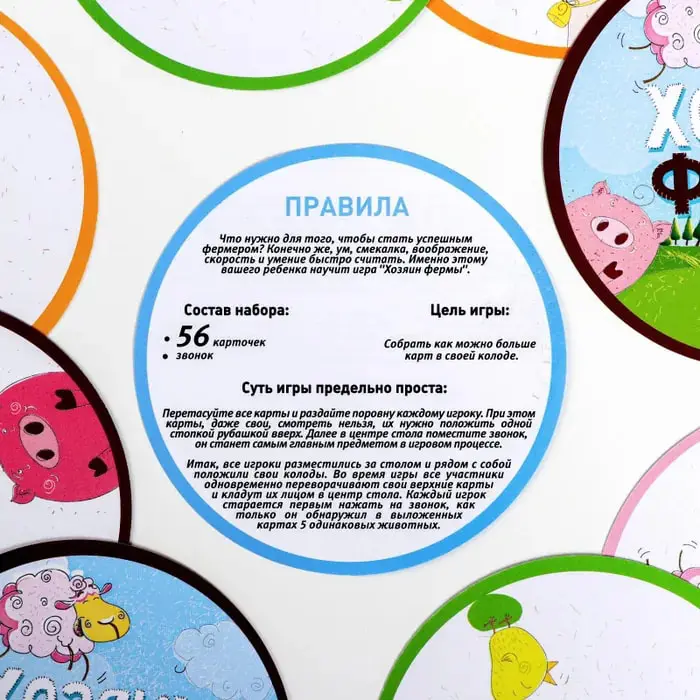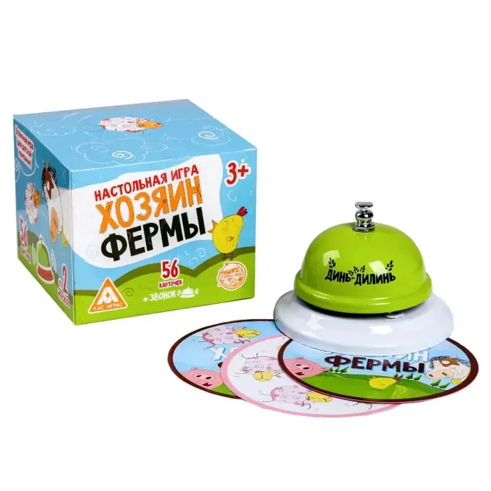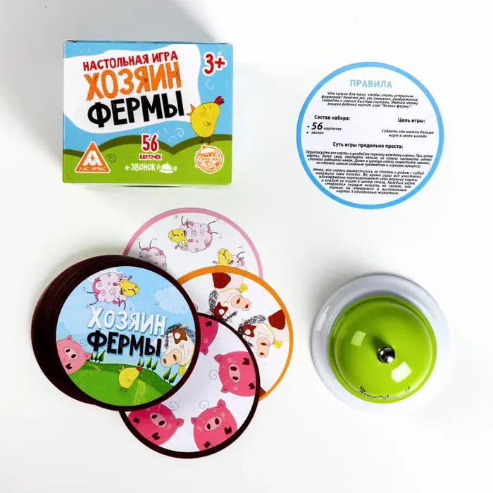 Внутри вы найдёте: 56 карточек; звонок; правила игры.