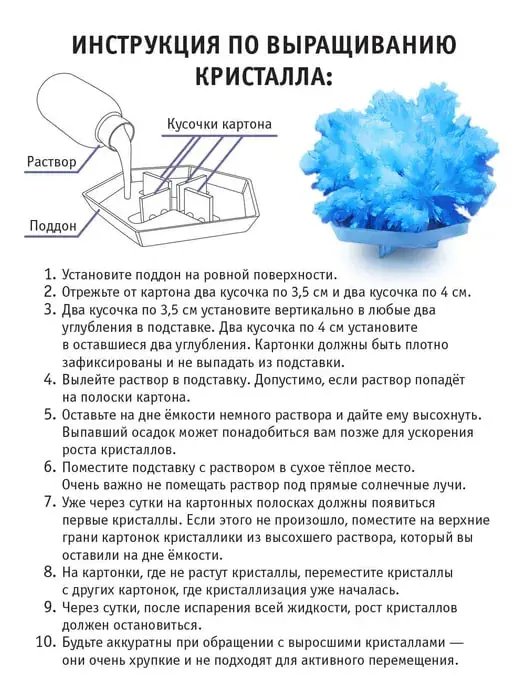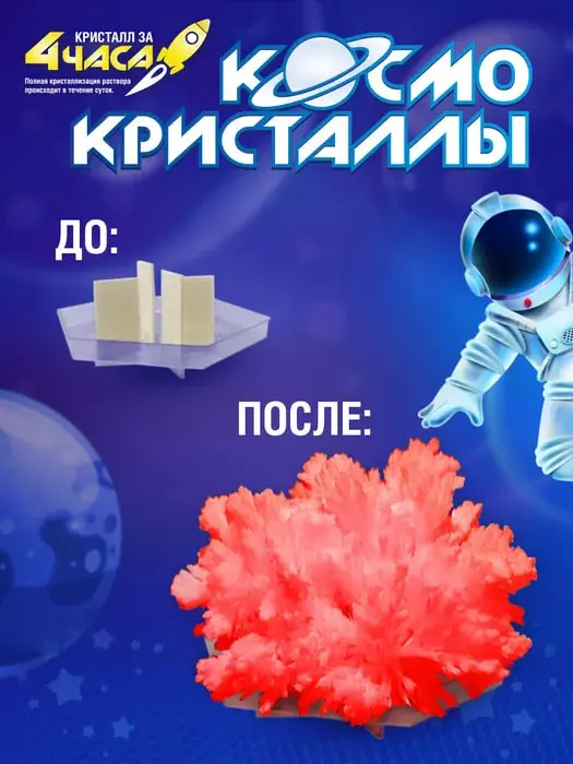 Наборы для опытов Космокристаллы - это наборы для выращивания кристаллов в домашних условиях. Данный набор для проведения опытов - это интересная игра для всей семьи, полезный набор для учебы, а также увлекательный подарок для детей. Создавая яркие растущие кристаллы у себя дома, ребенок учится познавать мир и ставить научные эксперименты. Собственные усилия и ожидание появления кристалла принесут юному творцу настоящий восторг и радость. Кристалл начнет расти уже через 2 часа. Полная кристаллизация раствора происходит в течение суток. ВНИМАНИЕ. Чтобы кристаллизация прошла успешно, НЕ СТАВЬТЕ фигурку с раствором на подоконник, а также в другое прохладное или продуваемое место. Набор предназначен для детей возрастом от 8 лет. Опыты проводятся под наблюдением взрослых, в соответствии с инструкцией и правилами безопасности.