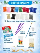 В набор для творчества входит: 15 брусочков воздушного пластилина; набор стеков; глиттер; помпоны; атласная ленточка; кисточка; баночка лака; подробная цветная инструкция.