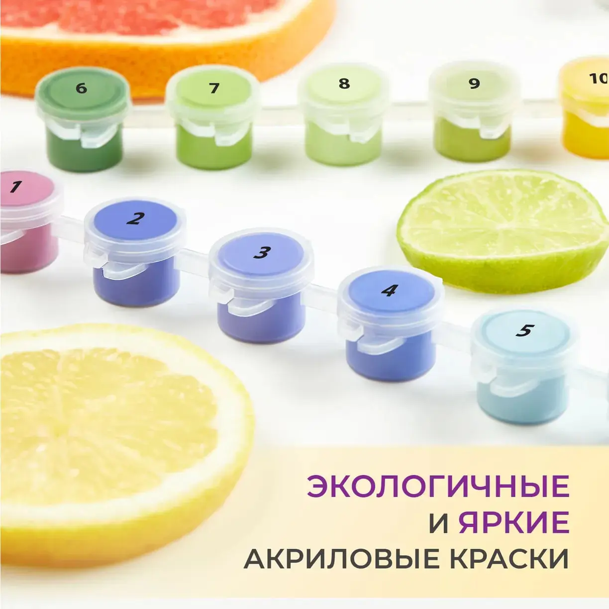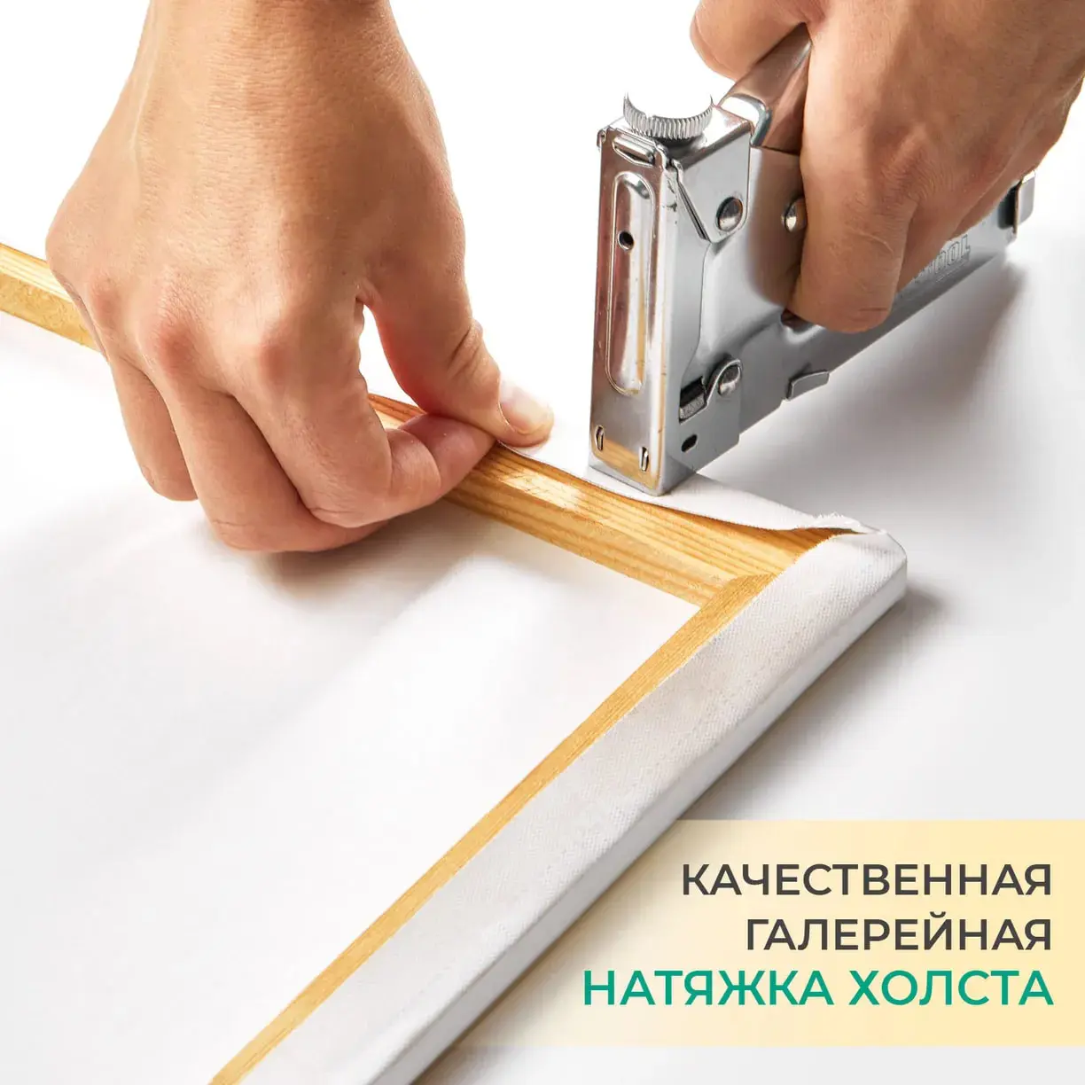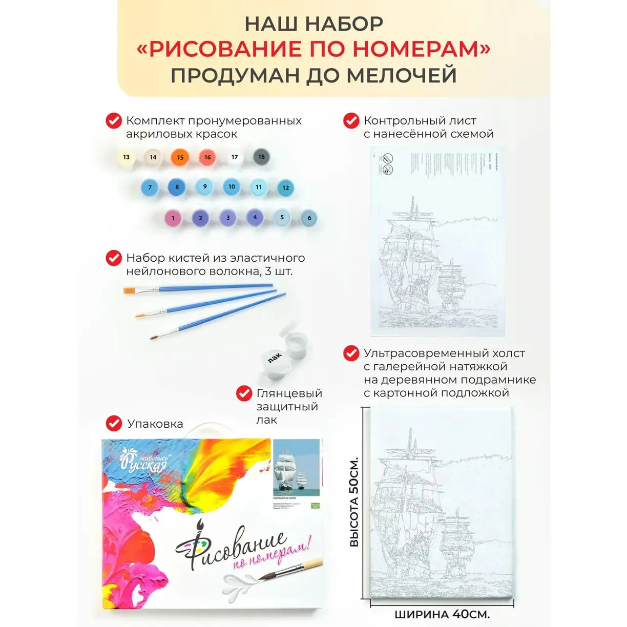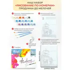 Набор для росписи по номерам позволит любому желающему приобщиться к искусству живописи. А готовый шедевр станет эффектным украшением интерьера или отличным подарком ценителю прекрасного. Процесс росписи прост. Рисунок разделён на множество мелких фрагментов, на каждом указано число. Оно соответствует цвету, которым нужно заполнить данный участок. В набор входят все необходимые оттенки красок. Состав набора: грунтованный холст, деревянный подрамник, комплект пронумерованных акриловых красок, набор кистей из эластичного нейлонового волокна, контрольный лист с нанесённой схемой, защитный лак.