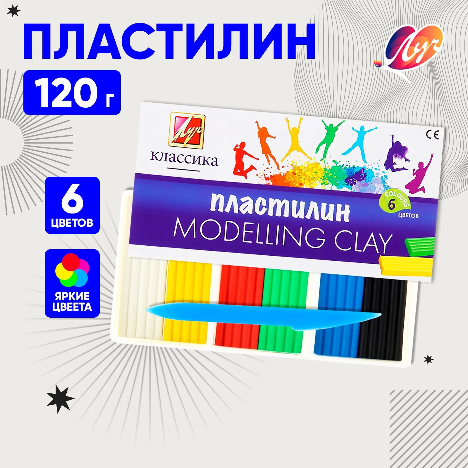 Соответствует европейским (знак СЕ) директивам безопасности. Вес бруска пластилина 20 гр.