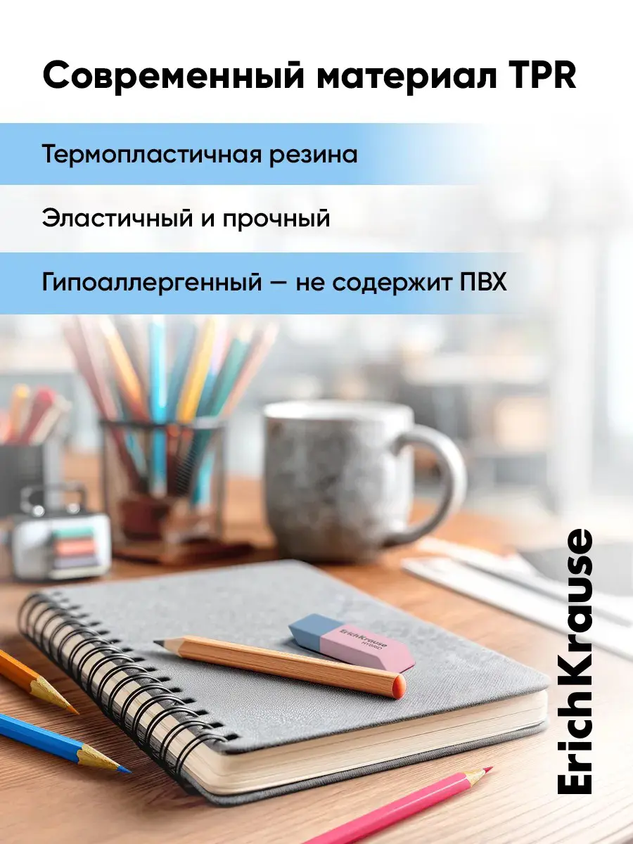 Двусторонний ластик с разной степенью жесткости из экологически чистого и гипоаллергенного материала термопластичной резины (TPR) с пониженным образованием крошек (Dust free).