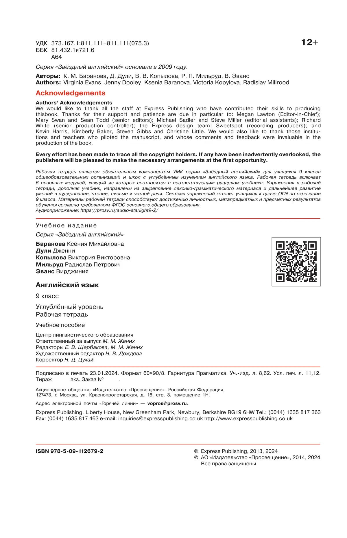 Рабочая тетрадь является обязательным компонентом УМК серии «Звёздный английский» для учащихся 9 класса общеобразовательных учреждений и школ с углублённым изучением английского языка.