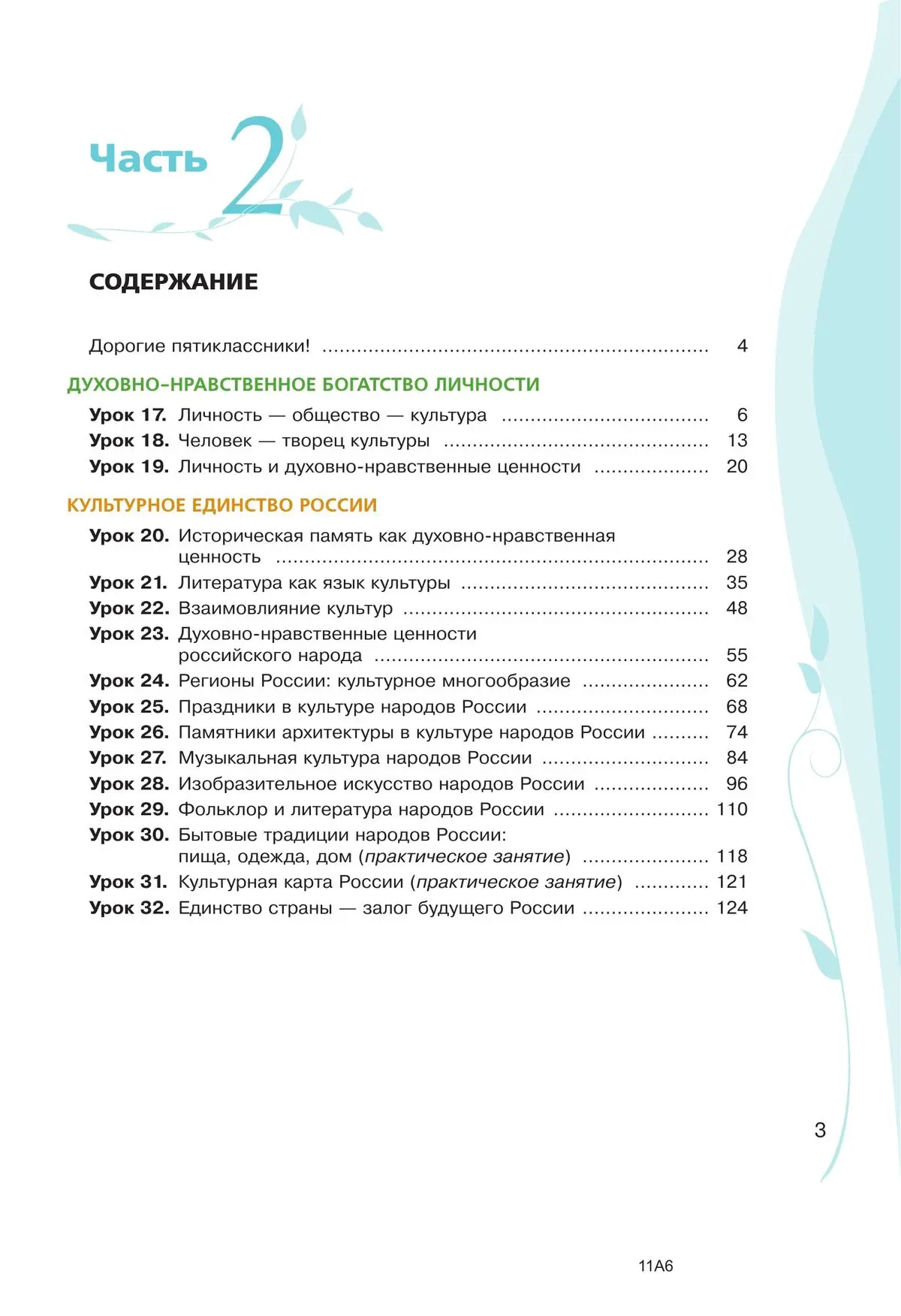 Часть 2 учебного пособия раскрывает темы: «Личность – общество – культура», «Человек — творец культуры», «Личность и духовно-нравственные ценности», «Историческая память как духовно-нравственная ценность», «Взаимовлияние культур», «Духовно-нравственные ценности российского народа», «Регионы России: культурное многообразие», «Праздники в культуре народов России», «Музыкальная культура народов России», «Изобразительное искусство народов России», «Фольклор и литература народов России» и др.
