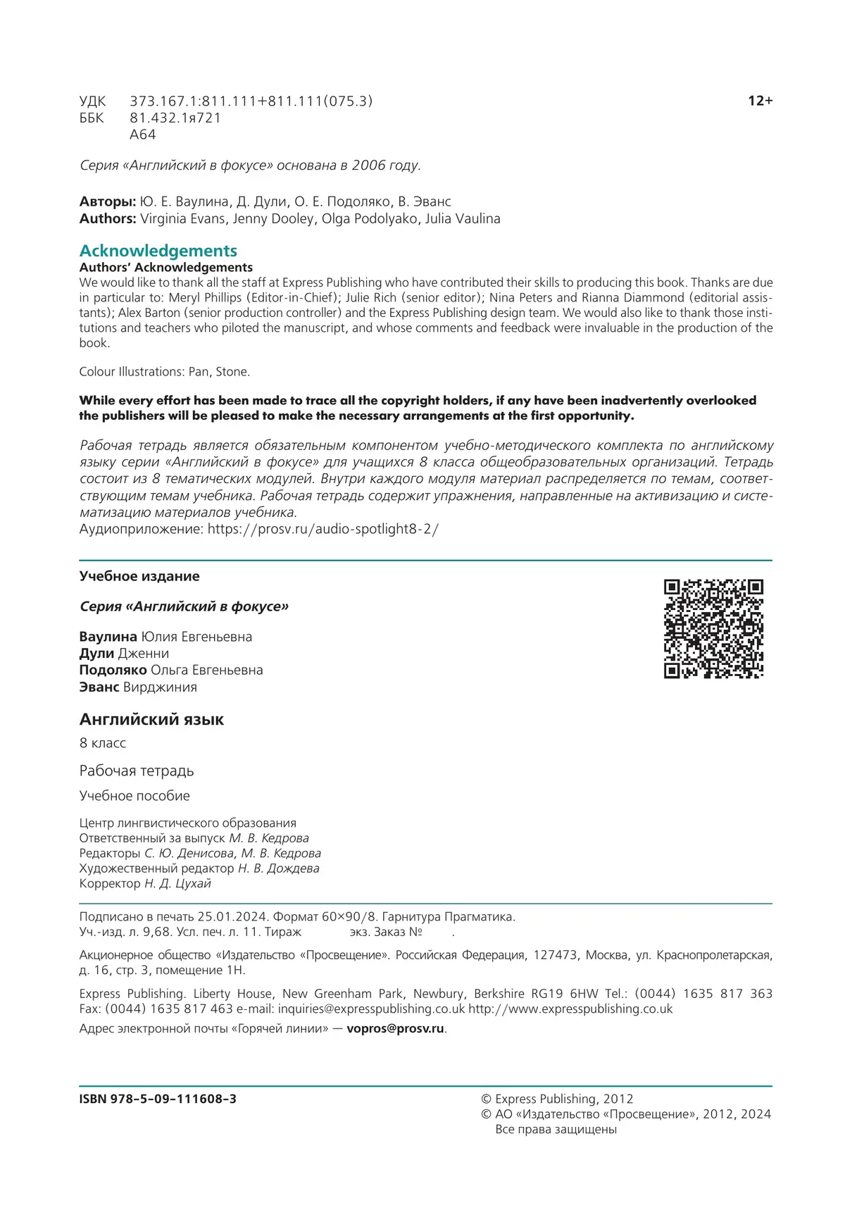 Рабочая тетрадь является обязательным компонентом учебно-методического комплекта по английскому языку серии «Английский в фокусе» для учащихся 8 класса общеобразовательных организаций.