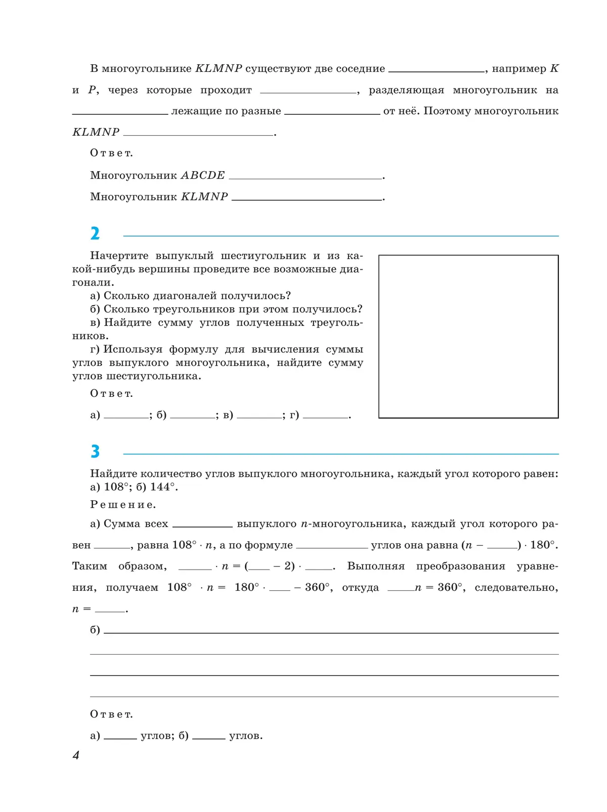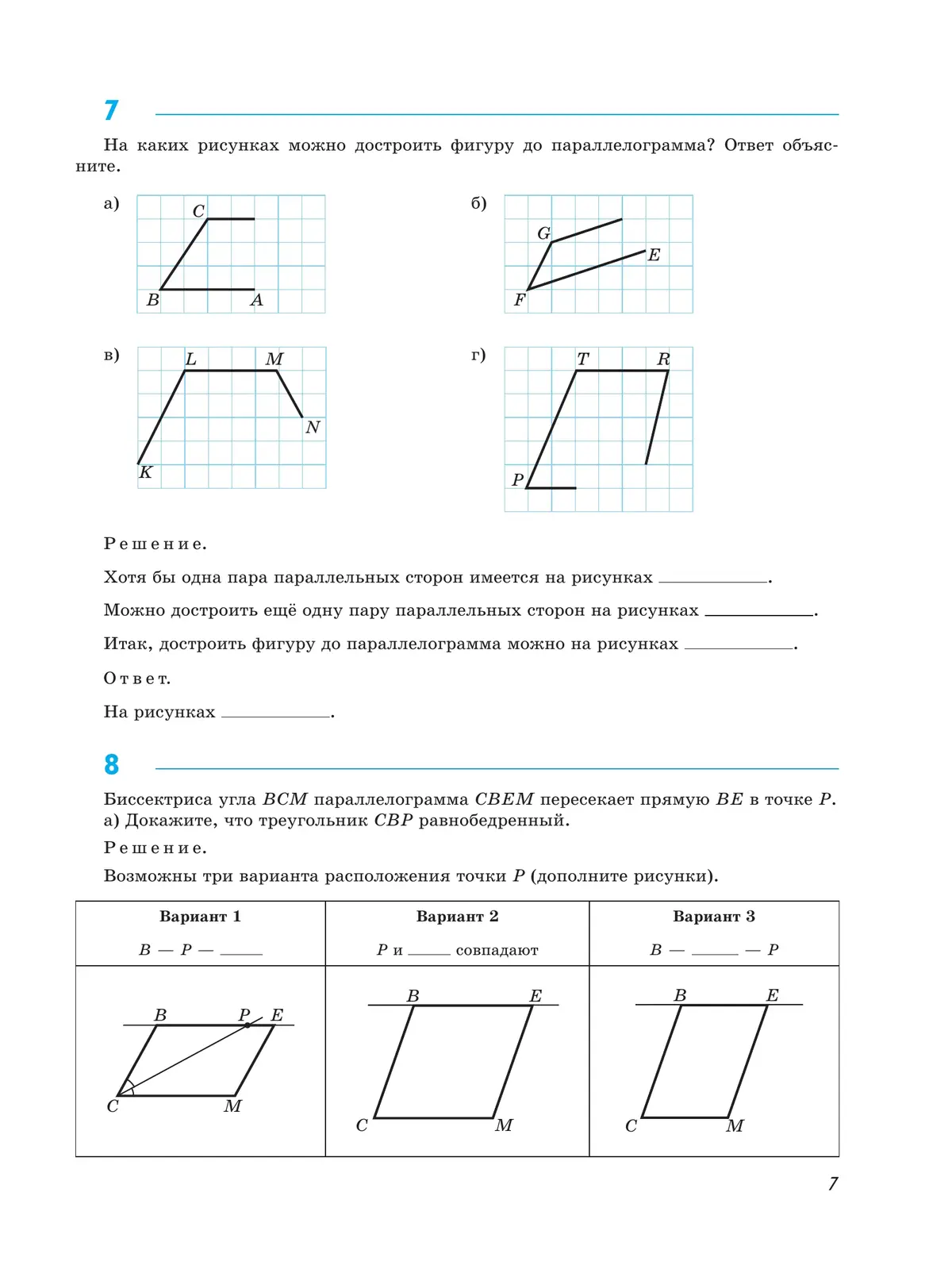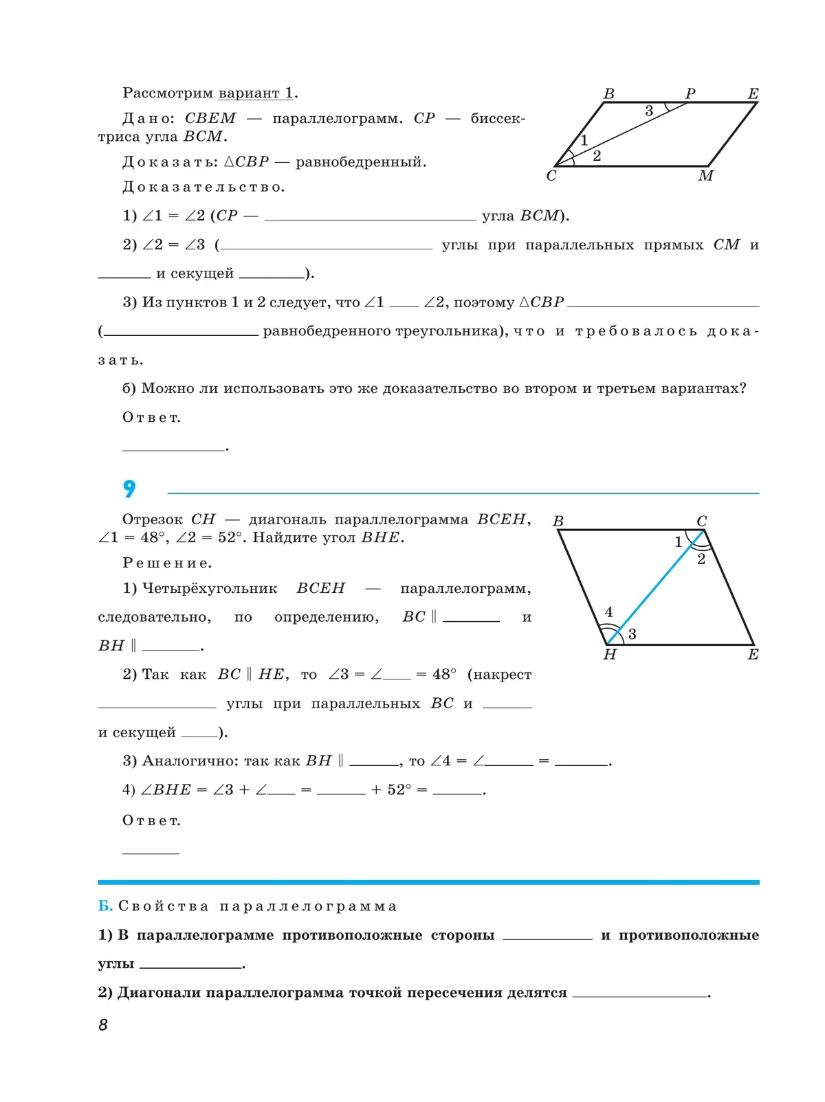 Пособие содержит задания для закрепления теоретического материала и все основные задачи по курсу геометрии 8 класса. Наличие текстовых заготовок облегчает ученику выполнение заданий в развёрнутой письменной форме, а учителю позволяет осуществлять оперативный контроль и коррекцию деятельности учащихся во время урока.
