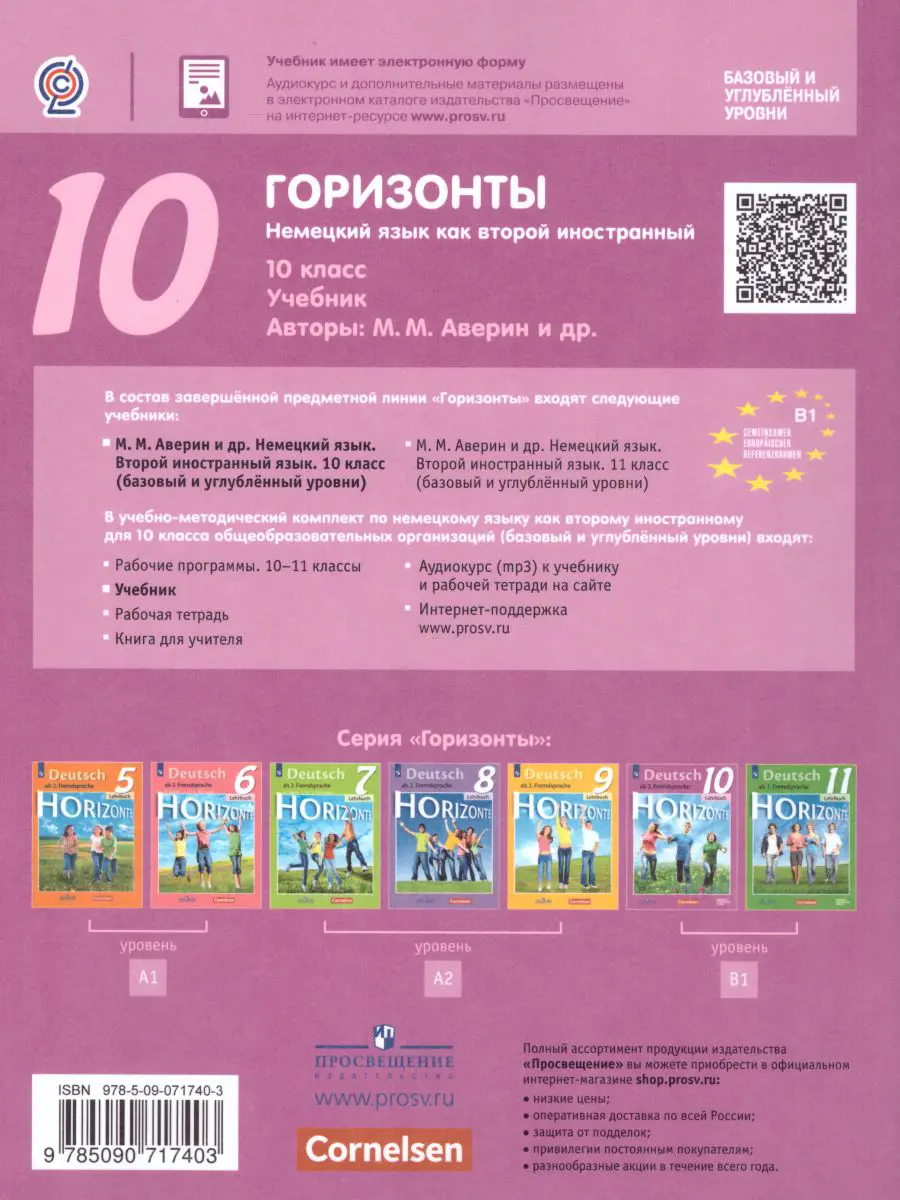 Учебник для 10 класса серии "Горизонты" предназначен для школ с изучением немецкого языка как второго иностранного на базовом и углублённом уровнях. Серия "Горизонты" — это совместный проект издательства "Просвещение" и издательства Cornelsen (г. Берлин).