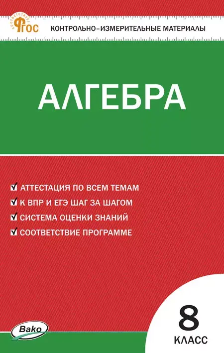 В пособии представлены контрольно-измерительные материалы (КИМы) по курсу «Алгебра» для 8 класса. Порядок тем соответствует учебнику Ю.Н. Макарычева, входящему в действующий федеральный перечень учебников. Структура КИМов аналогична структуре заданий ГИА (ОГЭ) и ЕГЭ по математике, что позволит подготовить учащихся к работе с подобным материалом. В конце издания предложены ответы ко всем тестам.