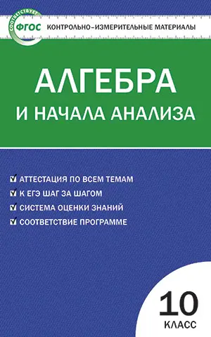 В пособии представлены контрольно-измерительные материалы (КИМы) по алгебре и началам анализа для 10 класса: тесты в формате заданий ЕГЭ, а также самостоятельные и контрольные работы по всем изучаемым темам. Ко всем заданиям приведены ответы. Предлагаемый материал позволяет проводить проверку знаний, используя различные формы контроля.