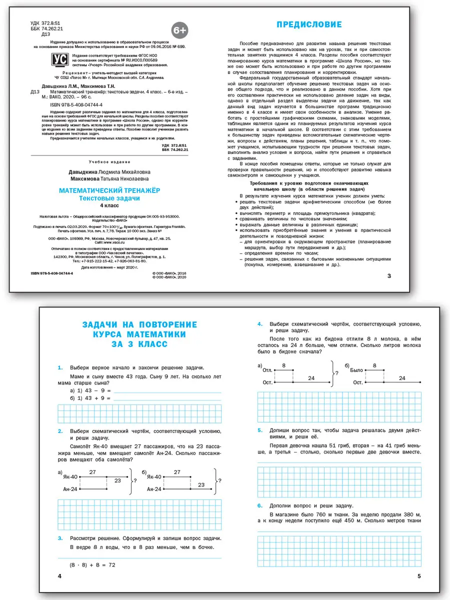 Издание содержит различные задания по математике для 4 класса, подготовленные на основе требований ФГОС для начальной школы. Разделы пособия соответствуют планированию курса математики в программе «Школа России», однако при корректировке тренажёр может быть использован и при работе по другим программам. В конце издания ко всем заданиям приведены ответы, а также дан справочный материал. Пособие позволит ученикам развить навыки решения текстовых задач.Предназначается учителям начальных классов, учащимся и их родителям.
