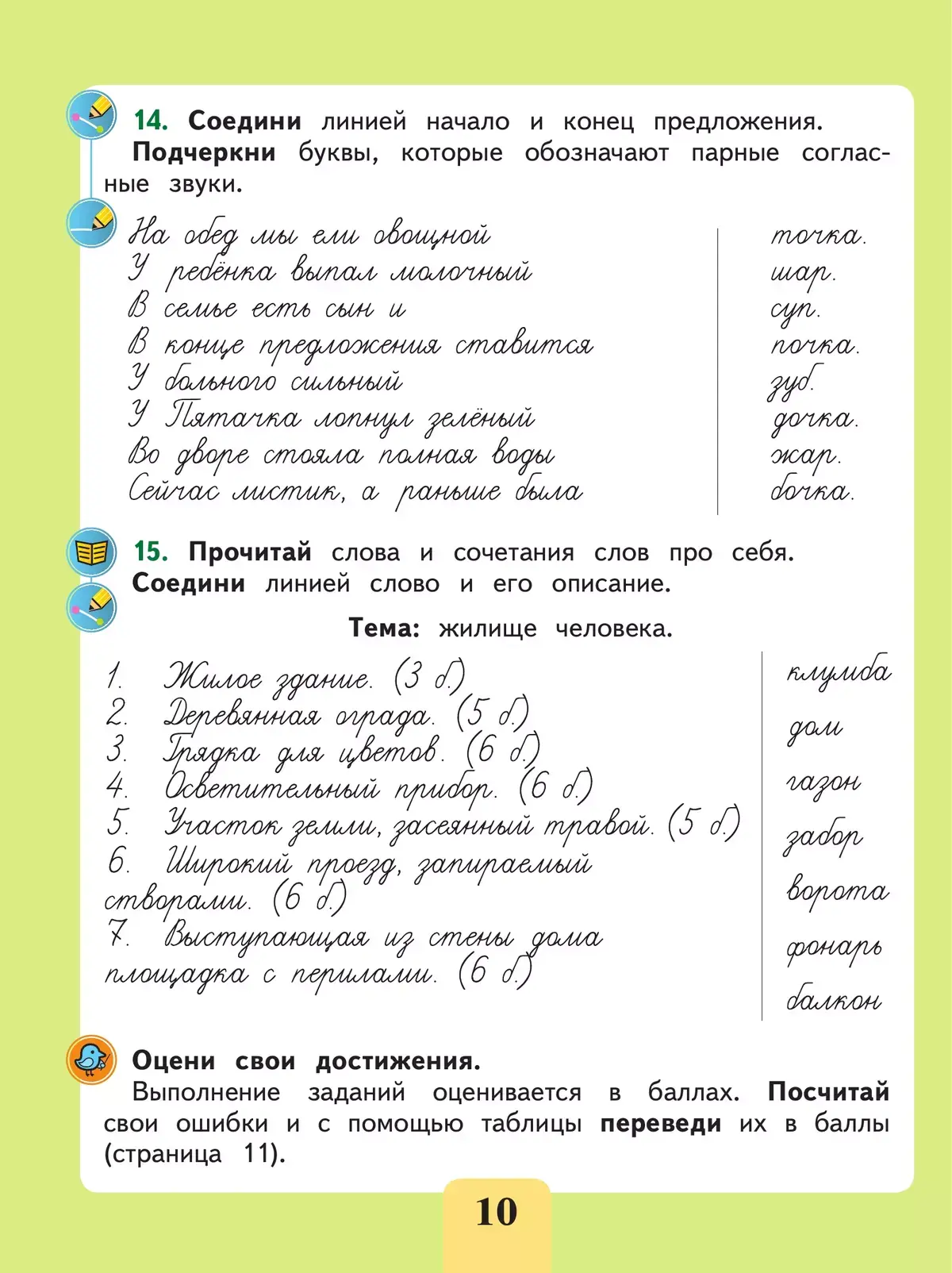 В конце каждого тематического занятия школьники с помощью системы баллов могут проверить и оценить результаты выполненных заданий. По завершении изучения тем предусмотрена проверочная работа. Все текстовые задания для письменного или устного выполнения оформлены рукописным шрифтом.