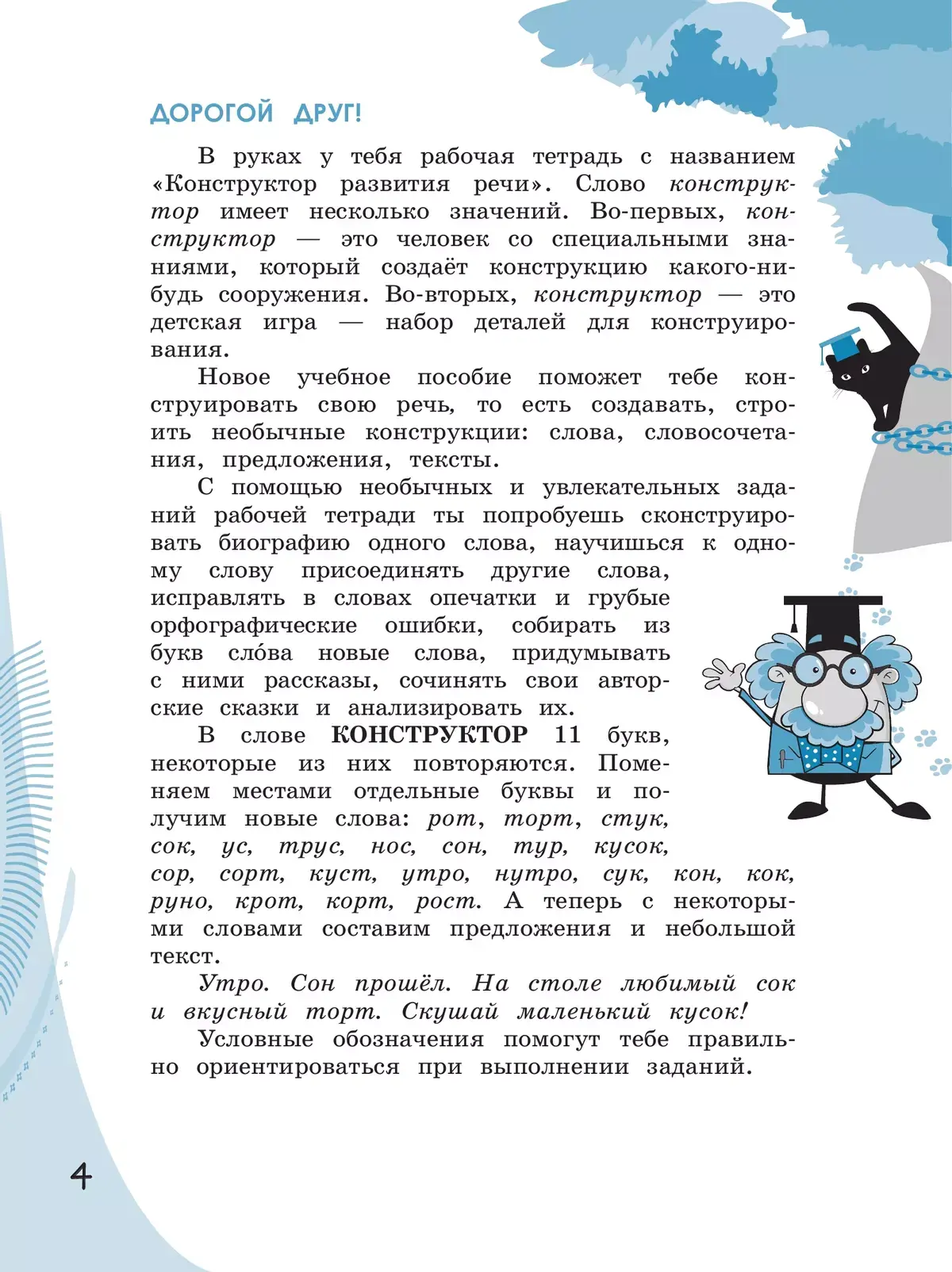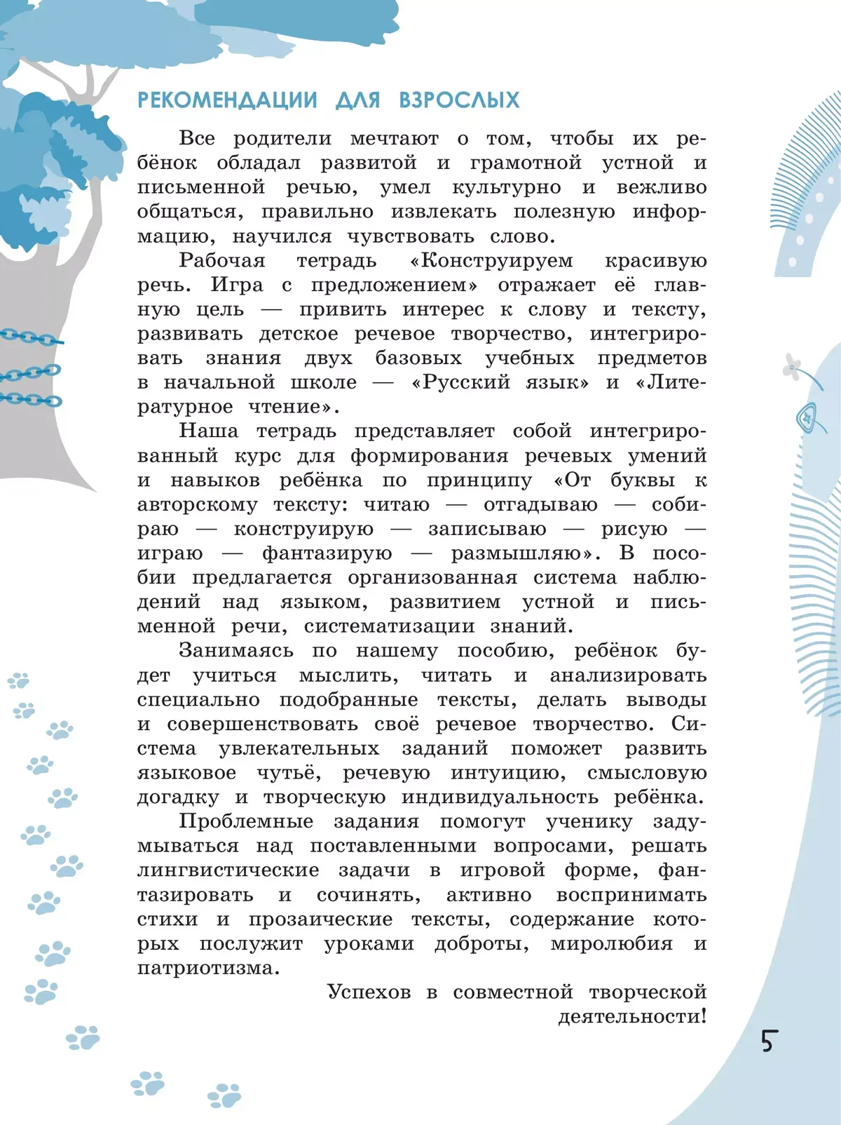 Материалы тетради включают систему увлекательных и интересных упражнений, творческих заданий, развивающих игр для обучения последовательной и комплексной работе со словом, предложением, текстом, для индивидуальной и коллективной работы в школе и для домашних занятий родителей с детьми.