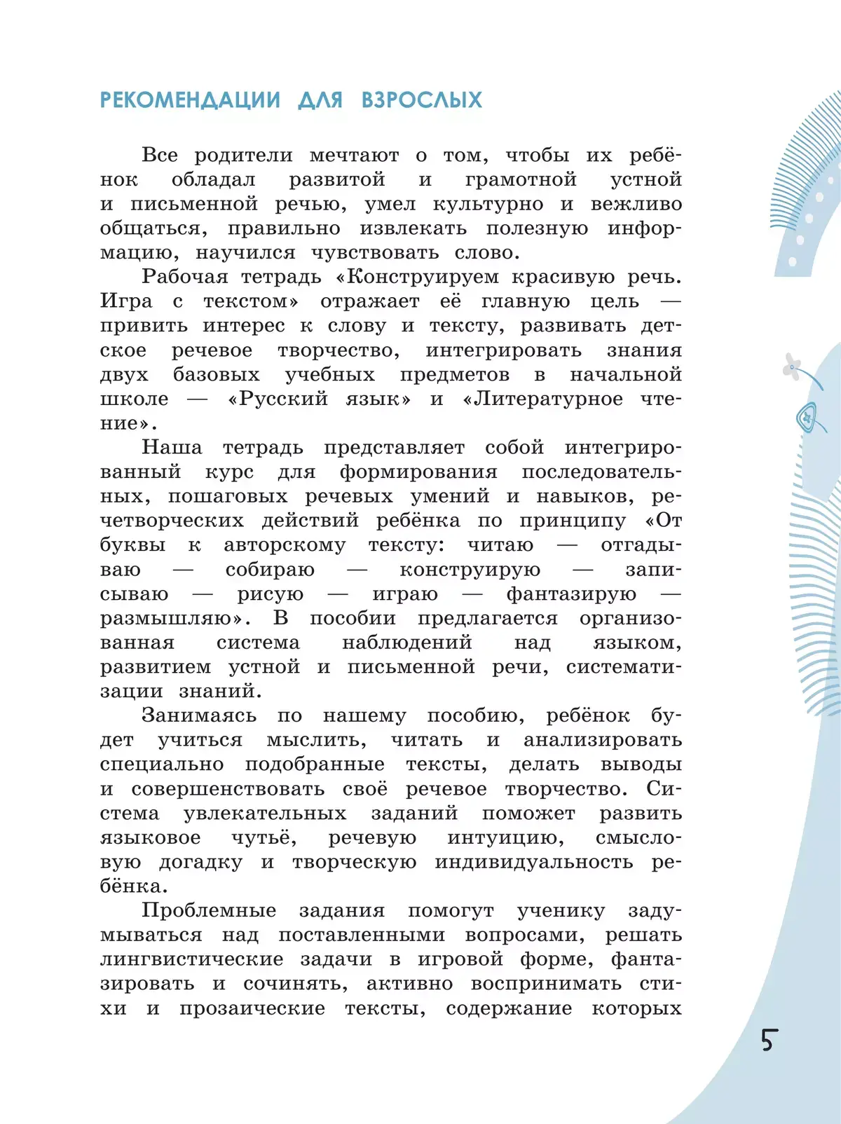 Материалы тетради включают систему увлекательных и интересных упражнений, творческих заданий, развивающих игр для обучения последовательной и комплексной работе со словом, предложением, текстом, для индивидуальной и коллективной работы в школе и для домашних занятий родителей с детьми.